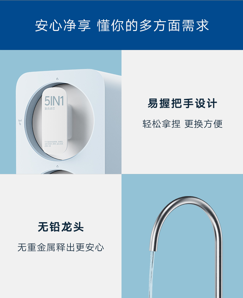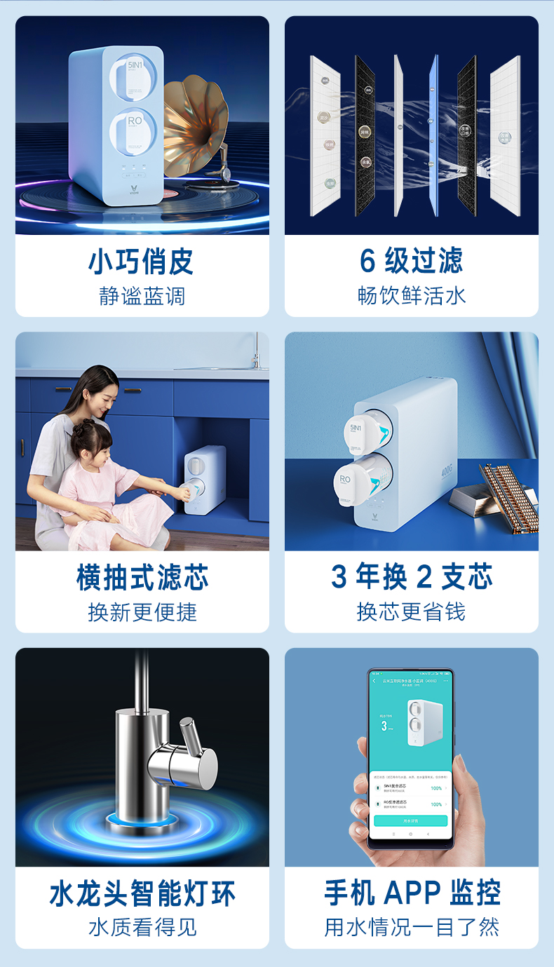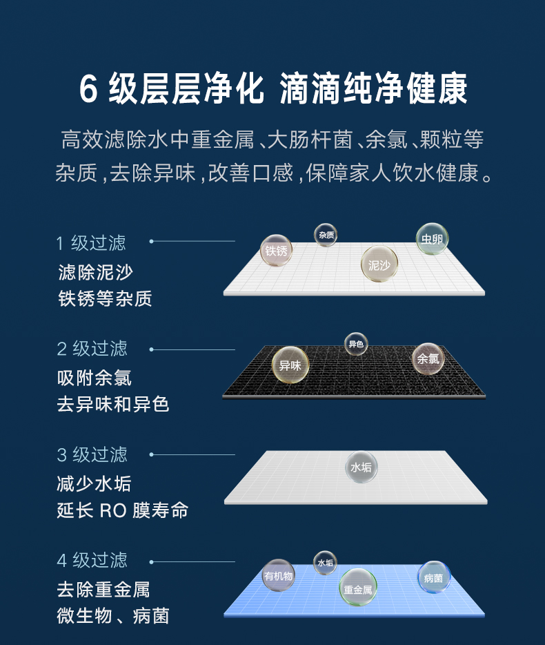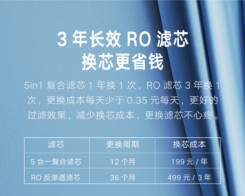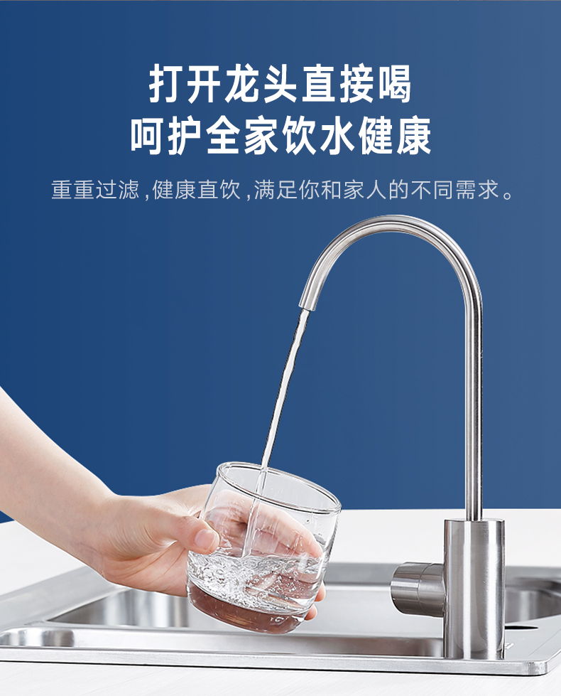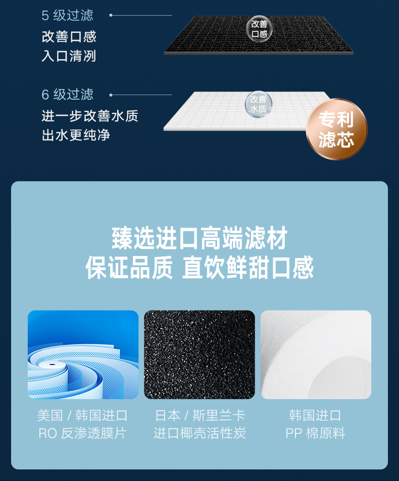 核心的滤芯方面,前置5合1滤芯,去除泥沙、铁锈、余氯、异味等,最后是反渗透滤芯,直接过滤重金属离子、有机物和病菌,两种滤芯组合,既能有效的过滤水源,又能改善口感,出水鲜甜可直饮,煮开后无水垢,滤芯内使用的均是进口高端材料,受国内国外两重检验,品质优秀。