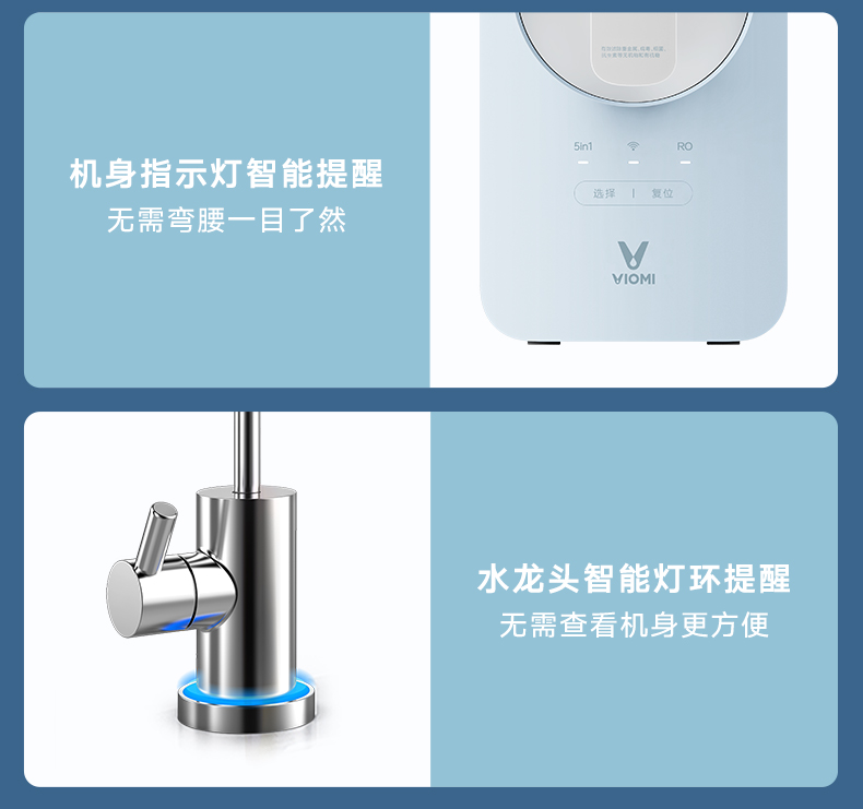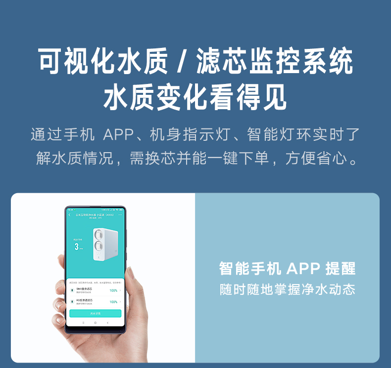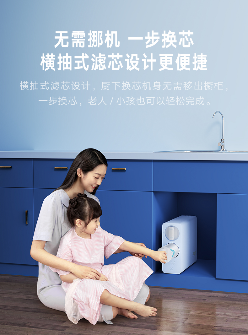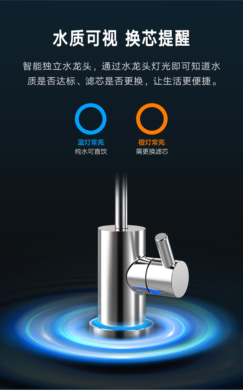 其他的细节方面,智能显色水龙头设计,蓝灯表示可直饮,橙灯则需要更换滤芯,还能搭配APP使用,随时随地的掌握净水状态,滤芯为横抽式设计,一步换芯,无需拆机,老人和小孩也能够轻松完成。