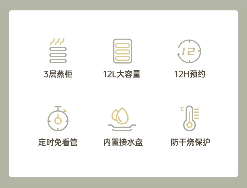 机身使用食品级PP材质,不含双酚A,配加宽积汁盘,使脏水分离。能12小时智能预约,还可10分钟~3小时保温可调。智能感应监控,当缺水时自动断电,高温自动断电。
