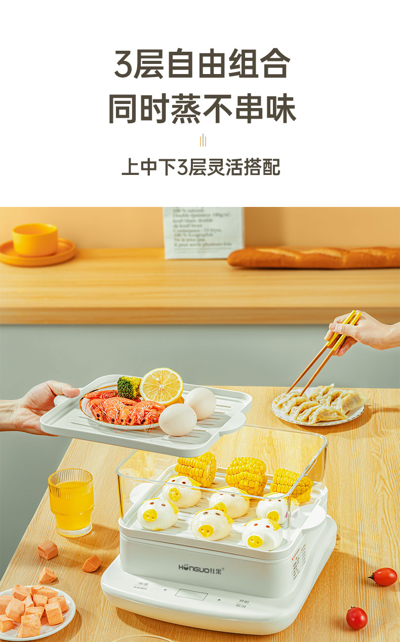 这款红果 多功能三层电蒸锅,3层组合设计,可自由组合,共有12L大容量,可以一次性蒸多种食物,同时蒸也不串味。