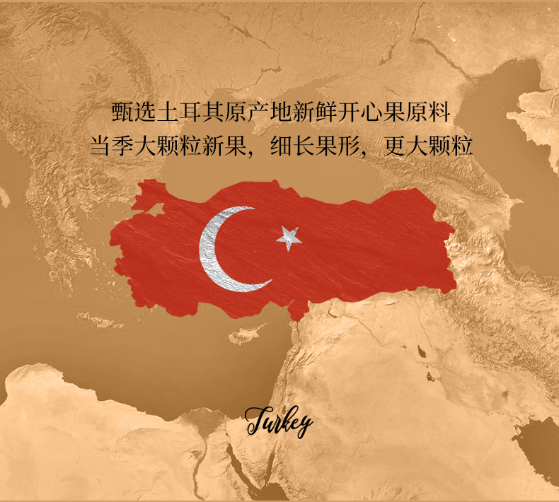 土耳其是世界第三大开心果出产国,土耳其开心果与美国开心果略有不同,土耳其开心果外形细长,紫衣绿仁,壳薄仁厚,果仁紧致偏小,咀嚼更有味道。