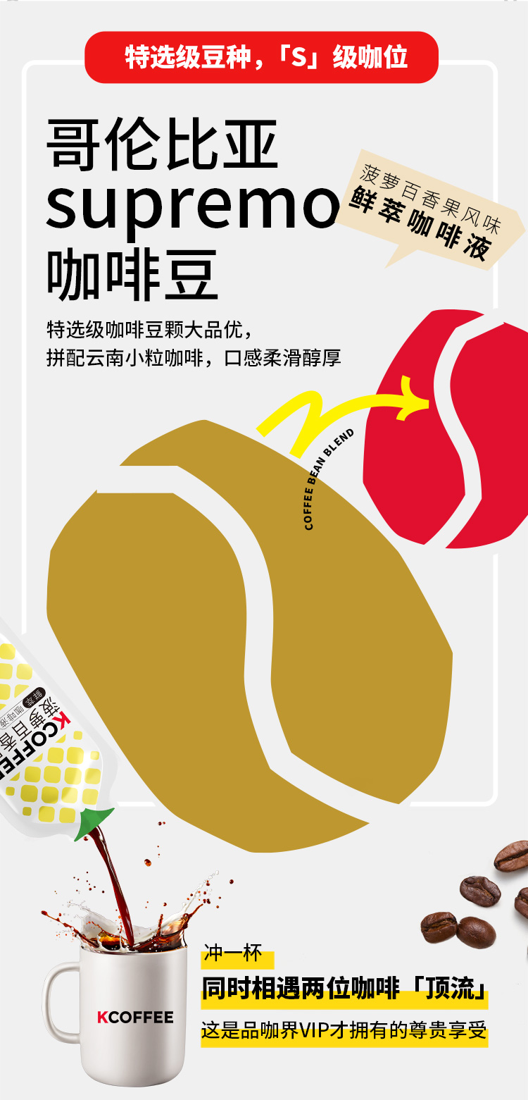 这款 KCOFFEE 鲜萃咖啡液,规格: 20ml*12包,现在应季新推出菠萝百香果风味,哥伦比亚特选级咖啡豆和云南小粒咖啡豆磨制,搭配>40%的真实菠萝果汁,热情百香果风味增加整体果味,夏日专属气息轻松调制!免冲煮免滤泡,无论冷水热水、牛奶、苏打水、茶饮甚至是冰块,倒入杯中都能冲调,醇香浓郁,层次丰富。