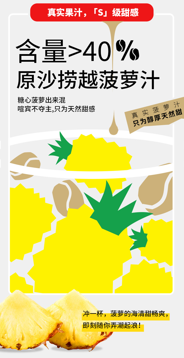 夏日专属口味清新上市!>40%原沙捞越菠萝汁搭配哥伦比亚特选级咖啡豆,渲染属于夏天海浪沙滩的味道!常温锁鲜,即溶即享,潮流又香浓。