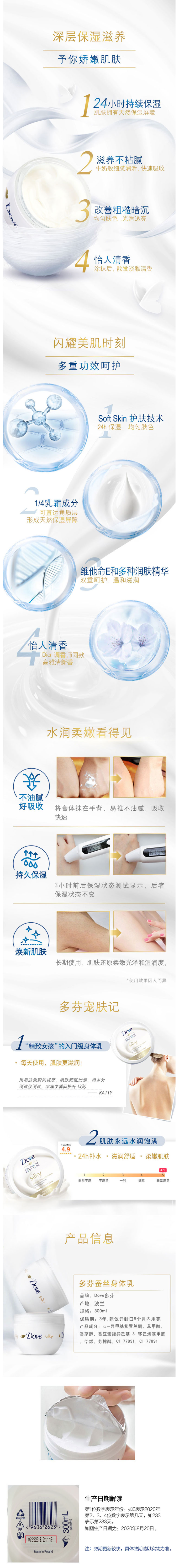 规格是300ml*3瓶。这款多芬Dove美白润泽身体乳,是一款滋润型身体乳霜,1/4乳霜毫微胶囊分子可快速输送于皮肤直达角质层,好吸收不油腻,还特别添加了维生素E和多种润肤精华,双重修护效果,温和滋润全身,能24小时持久保湿,全时呵护,美白肌肤,改善肌肤粗糙暗沉,涂抹后全身散发淡雅清香。