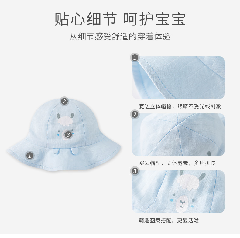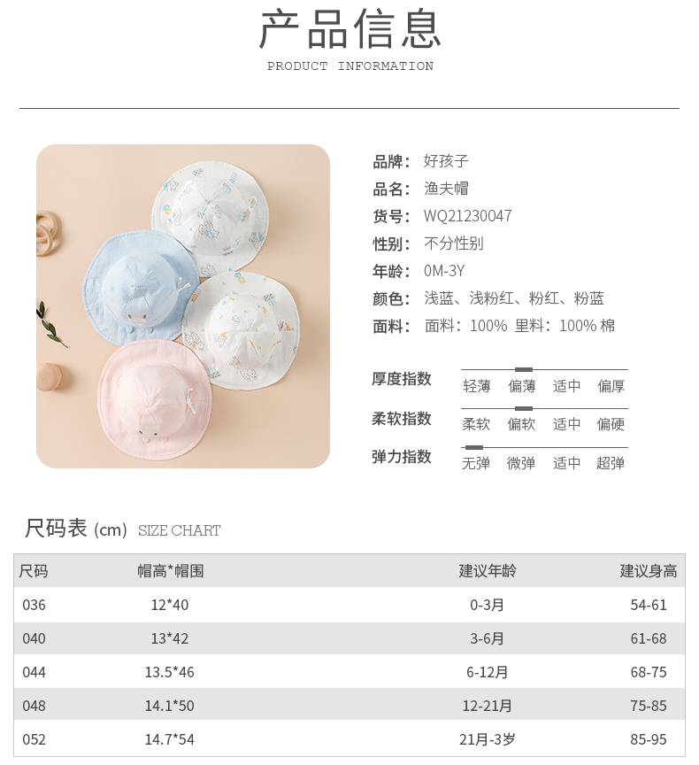 多色可选。这款Goodbaby 好孩子 宝宝纯棉渔夫帽,100%纯棉,面料柔软细腻,亲和宝宝幼嫩肌肤。宽边立体帽檐,眼睛不受光线刺激。舒适帽型,立体剪裁,多片拼接。萌趣图案搭配,更显活泼。纺织品A类标准,让妈妈更放心。领券链接点此
