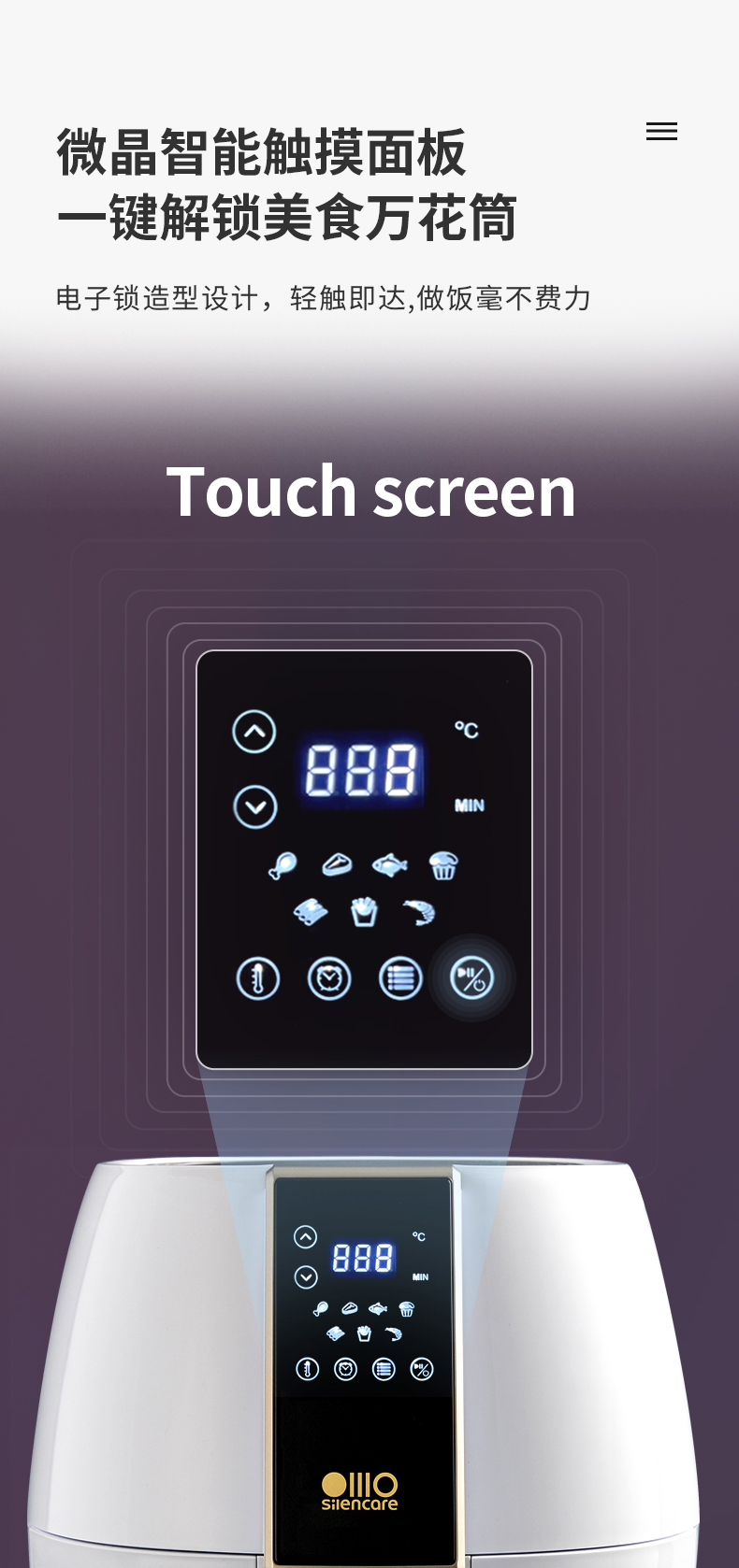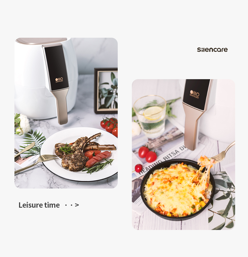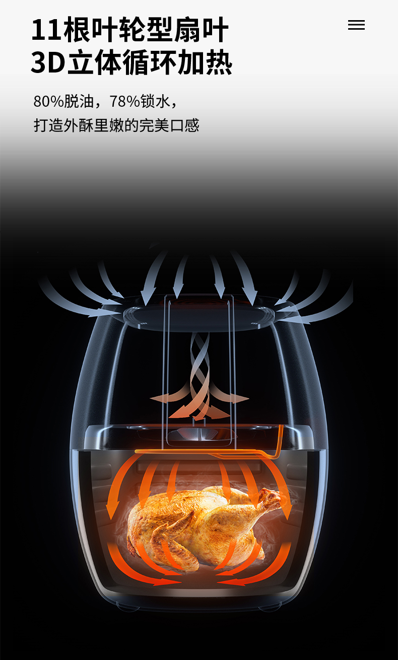 空气炸锅主要原理是热流在3D循环风扇的带动下,加速与食物的热交换,这样可以用高温空气代替热油,实现酥脆的口感。同时还能逼出食物中油脂,减少油脂摄入,相比油炸更健康。