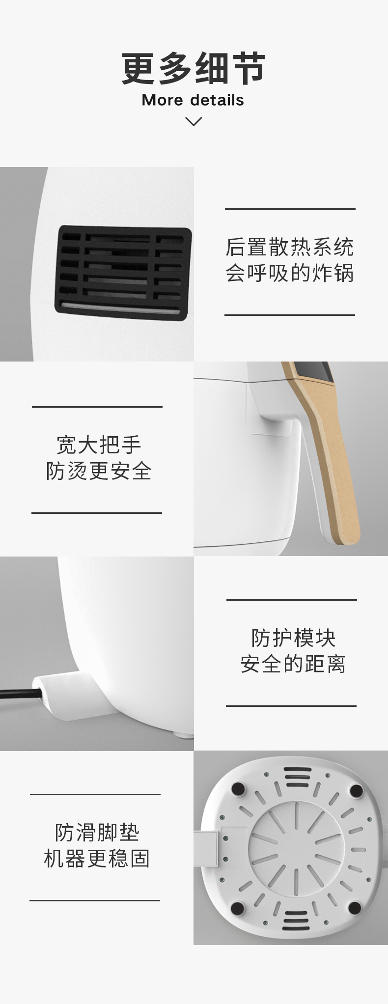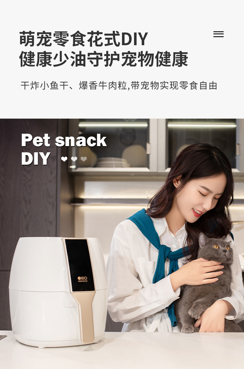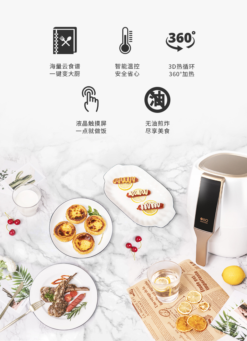 小米生态链企业出品,4升大容量 智能空气炸锅,外观简洁方便大气,微晶智能触摸面板,海量云食谱一键制作,小白也能秒变大厨,内置隐藏感温电子眼,灵敏感知食材温度变化,保障食物最佳口感,抽篮断电随取随拿,断电记忆功能,放回炸篮继续工作,4L容量,可满足3-4口之家使用。