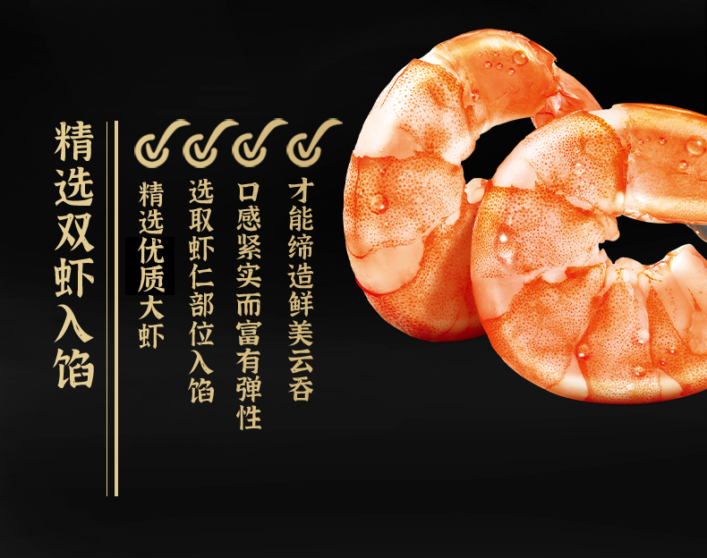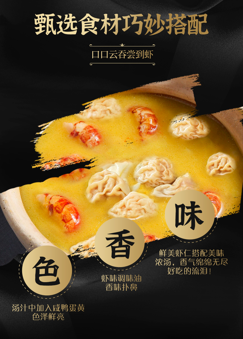 这款湾仔码头 虾皇云吞 ,精选弹嫩虾仁和原块前腿猪肉,肉质鲜美有嚼劲,口感弹嫩,搭配爽脆鲜嫩的蔬菜,营养多汁,以优质小麦粉制皮,口感劲道,皮薄有弹性,原汁原味,方便速食。