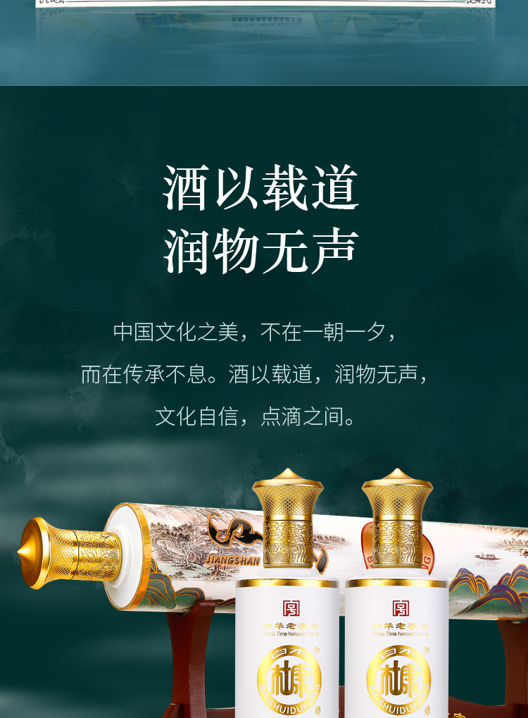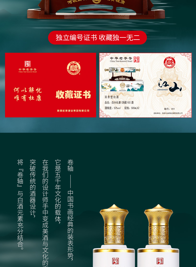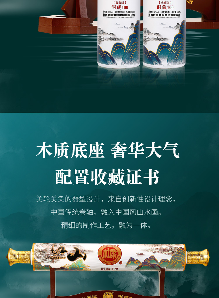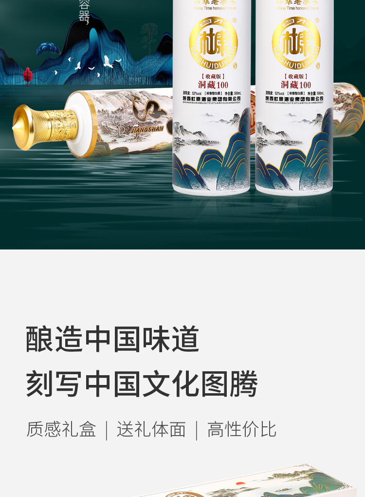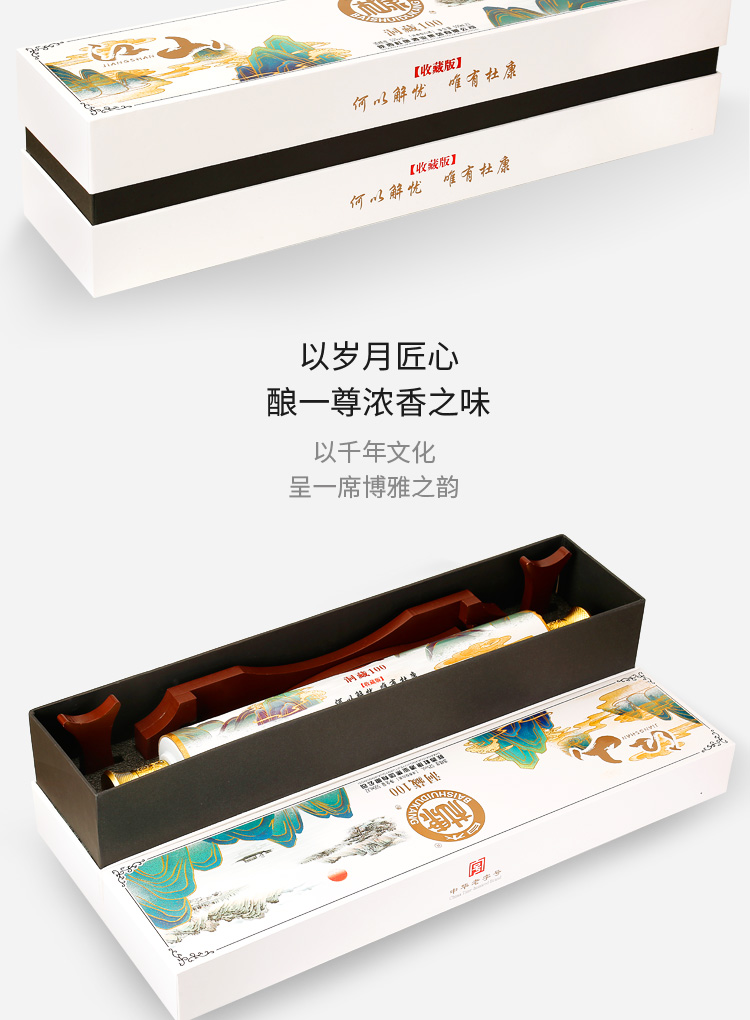 这款白水杜康 洞藏100 卷轴江山 52度浓香型白酒,规格:500mL*2瓶礼盒装,以优质高粱、小麦、大米、糯米、玉米5种粮食为原料,经陈年老窖发酵长年窖藏,调配而成,“香气悠久、入口甘美、入喉净爽恰到好处、酒味全面”中国风卷轴包装,收藏级礼盒设计,一眼就惊艳。