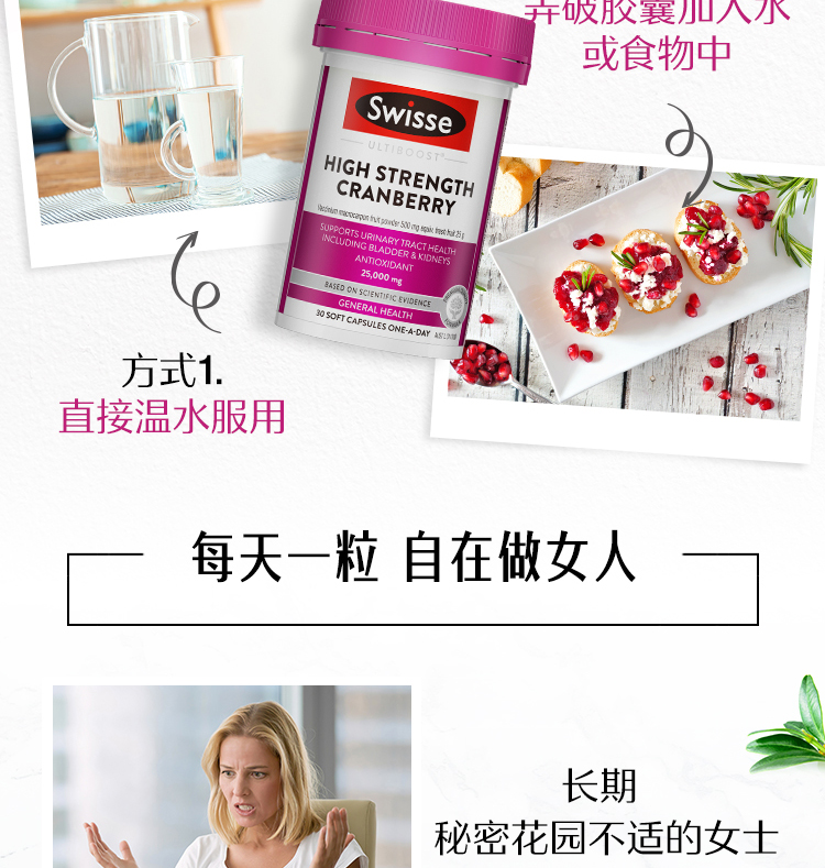 规格为30粒。这款澳洲进口Swisse 斯维诗 蔓越莓胶囊,选材引进北美湿地产量极少的纯蔓越莓果实,先进生产设备提取高浓缩活性成分,保留果实的营养,蔓越莓浓度是普通蔓越莓的3.8倍。