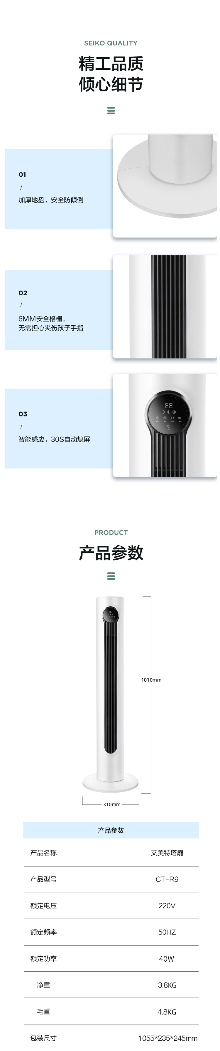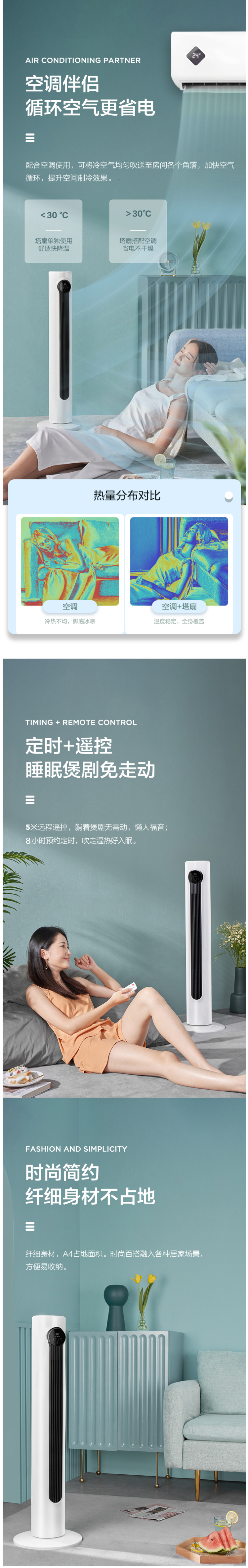 8档自由风量,标准风、自然风、睡眠风三种模式满足不同的需求。5m远程遥控控制,8小时预约定时,30秒自动熄屏。高度1010mm,底盘直径310*310mm,比一张A4纸都略小,节省空间不占地方。