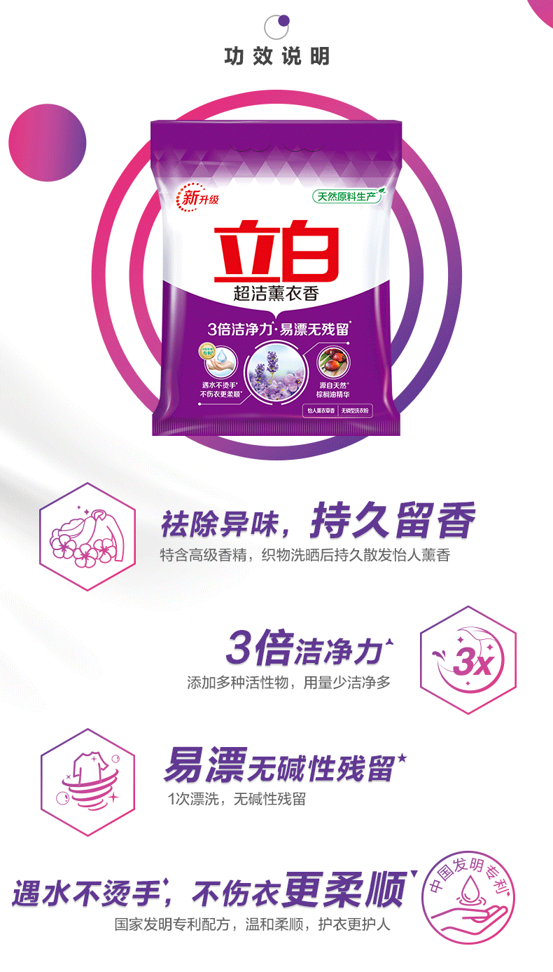 特含涤彩因子和污垢双向分离因子,深层洁净且不易伤衣~高档薰衣草香氛精华。洗晒后持久清新!护衣不伤手。手洗机洗都安心~领券链接点此