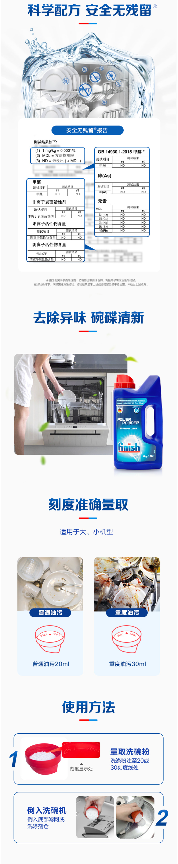 这款亮碟Finish洗碗粉,波兰产,洗碗机专用,功效是强力清洁和祛除异味,安全无残留,同时抑菌率99.9%。