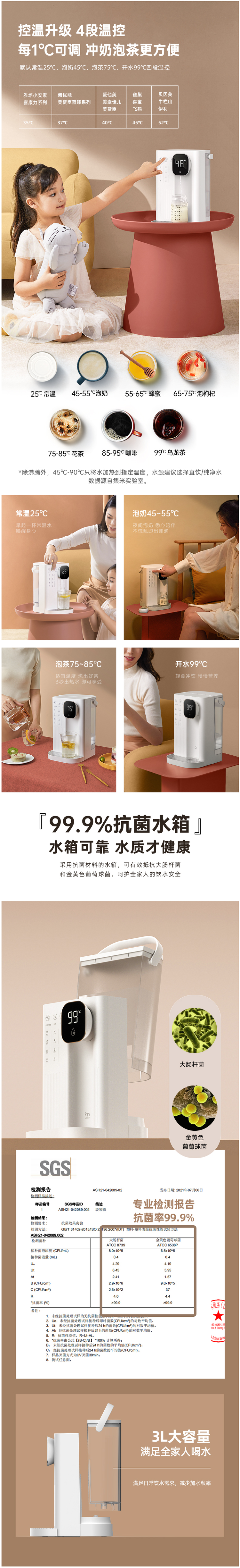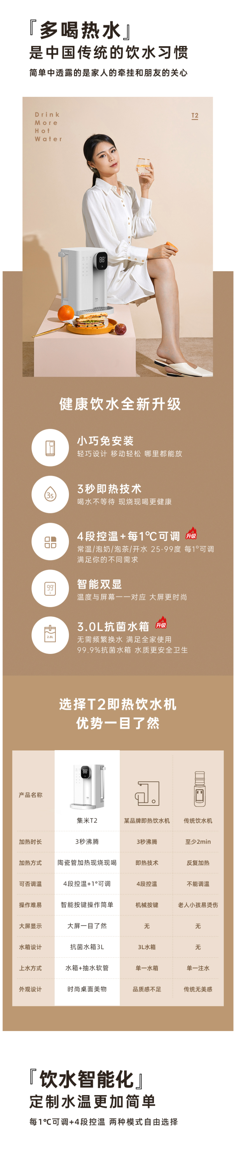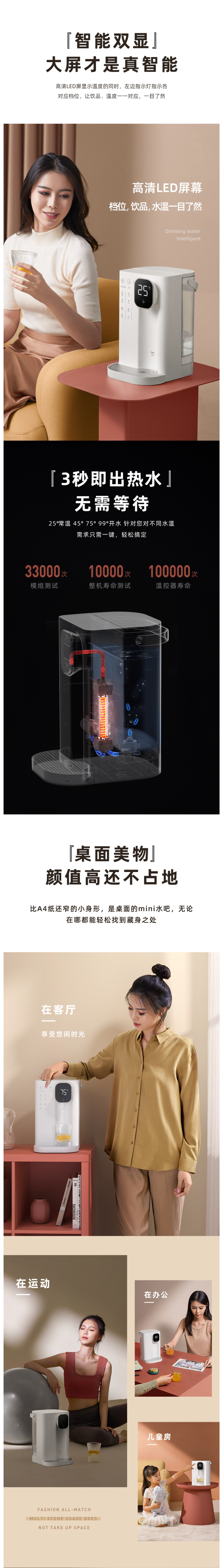 集米即热饮水吧,1秒即热,现烧现喝新鲜热水。拥有4档水温可选,LED智能显示,泡茶、泡奶粉、泡蜂蜜均可以找到适宜的温度。迷你机身,方便移动,满足厨房,卧室,浴室不同场景需求,磁吸式接水盘,使用方便。