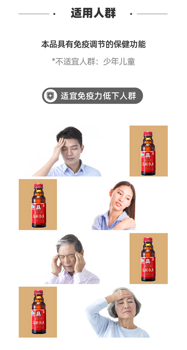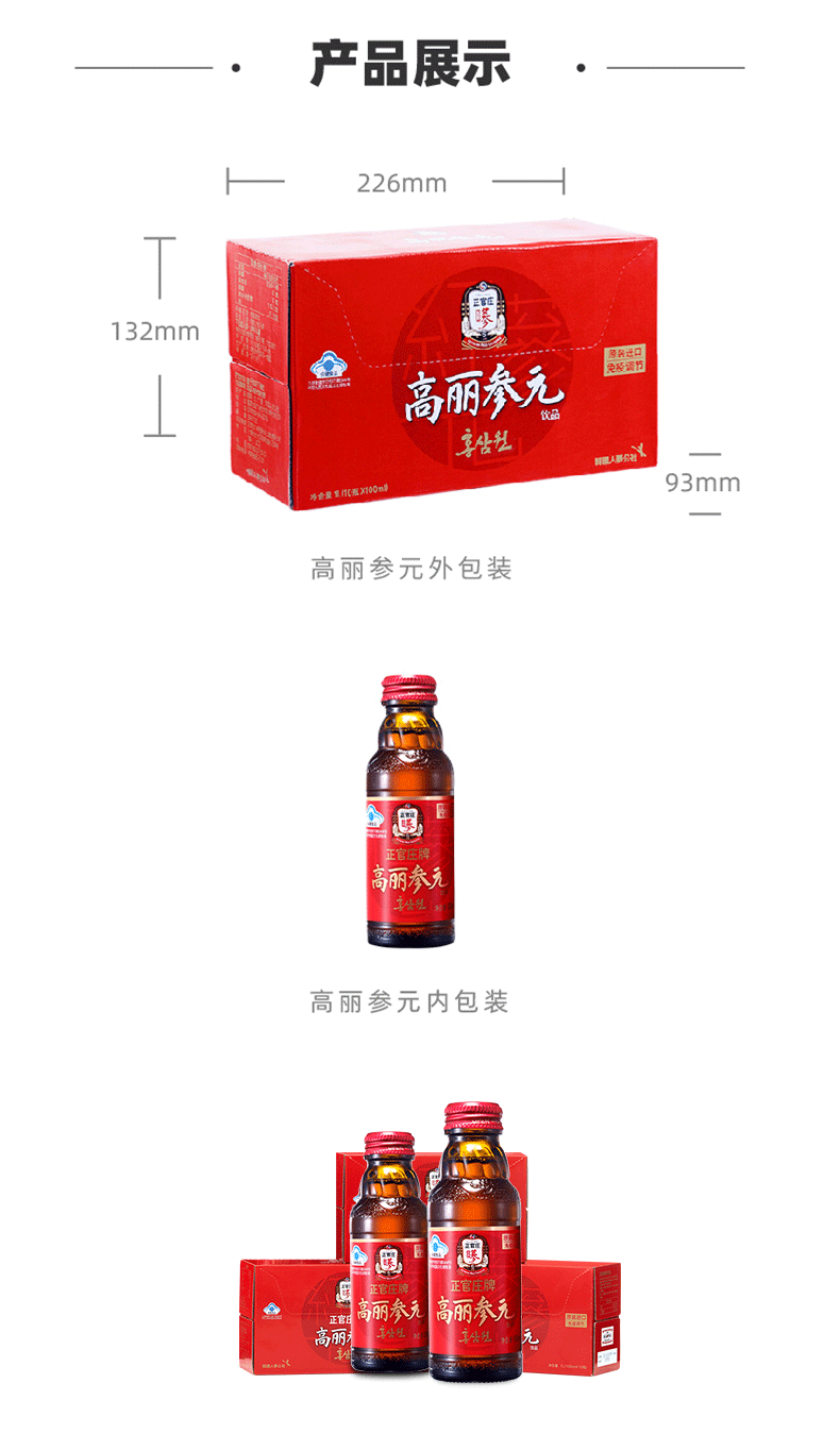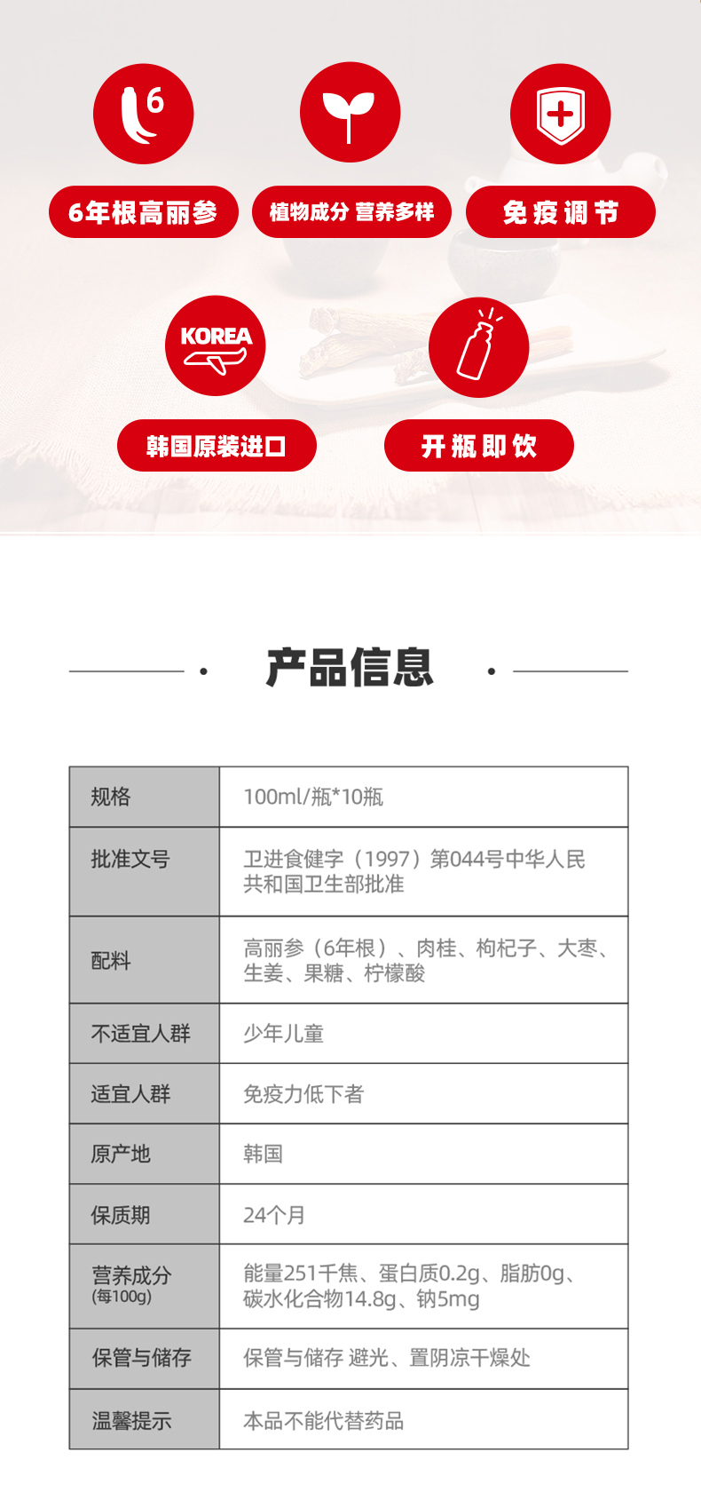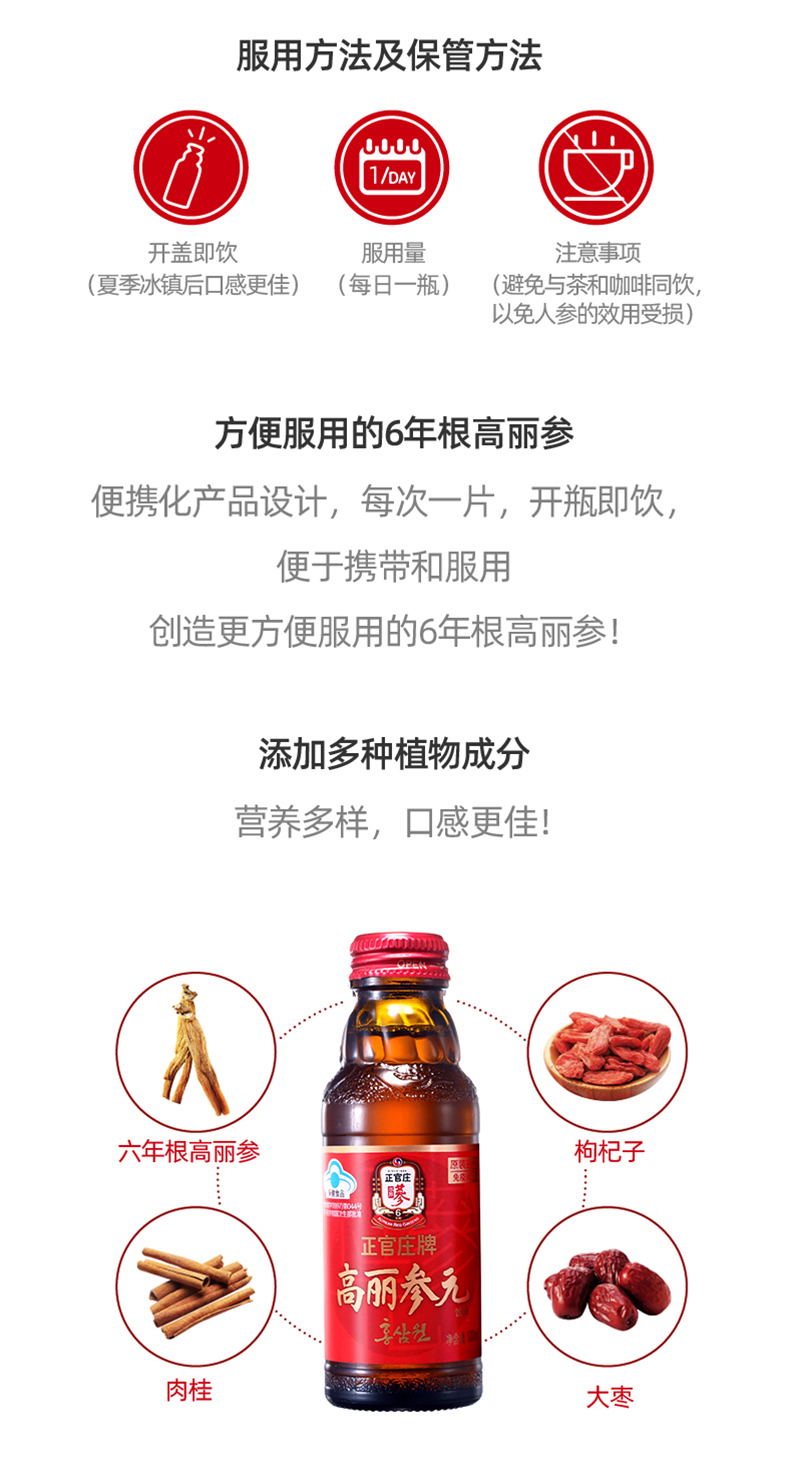 这款正官庄6年根高丽参元液,以6年根高丽参为原材料(高丽参富含32种人参皂甙),在以大枣、肉桂、枸杞子、生姜浓缩液为辅料。特点是易吸收,每支人参皂甙含量达10-20mg。服用方法:1日1次。能够大补元气,提高记忆力,小瓶包装,携带十分方便,可以随时随地饮用来增强活力。