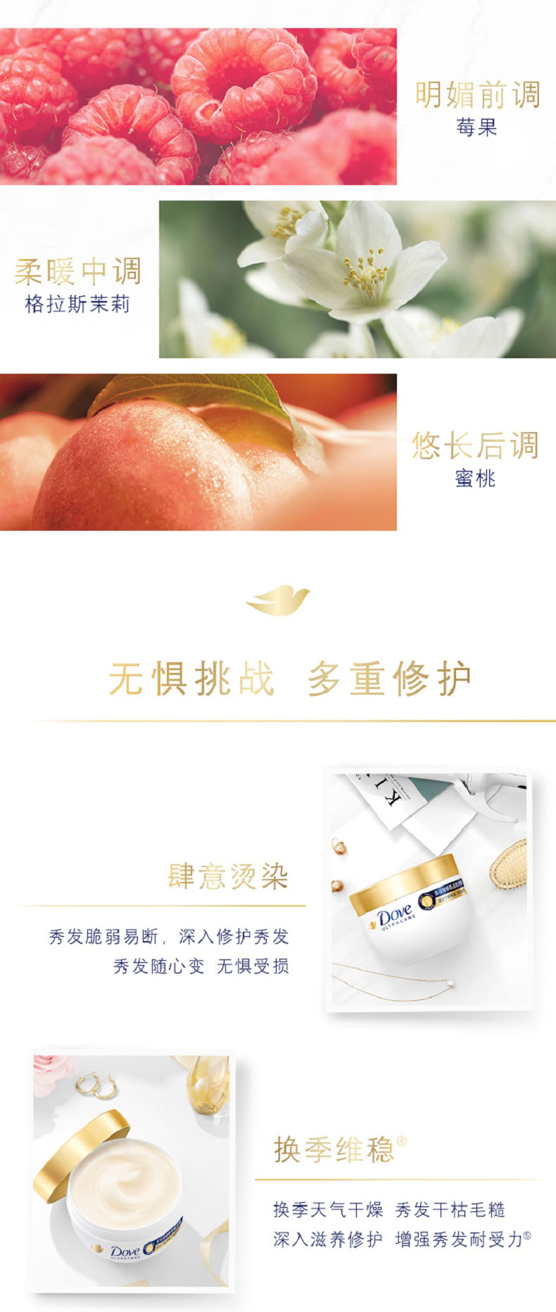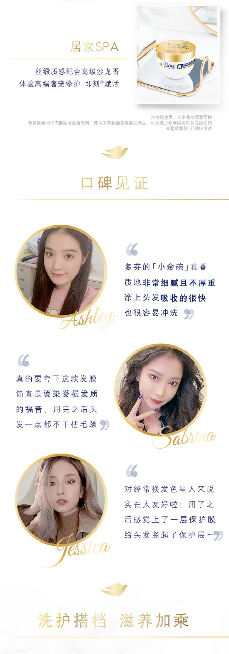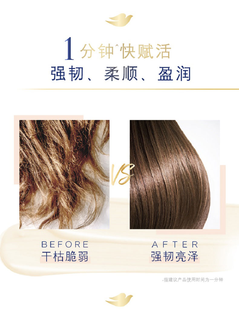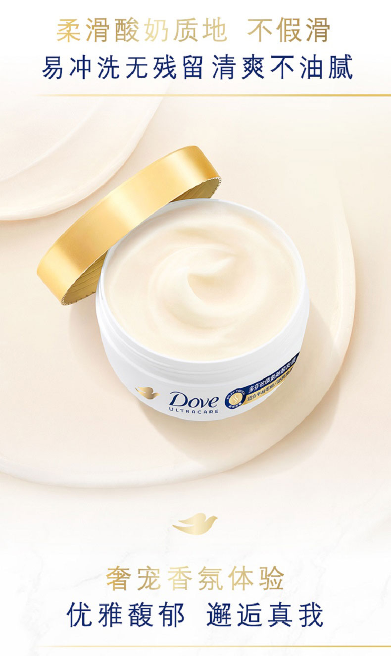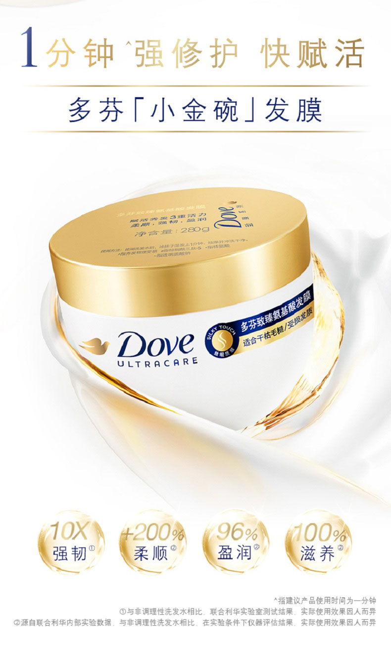 这款多芬 小金碗 氨基酸发膜,魔方干枯复活草遇水复活的原理,修护损伤,1分钟强效修复发质损伤,强韧、柔软、莹润头发,柔滑酸奶质地,易冲洗无残留,清爽不油腻。