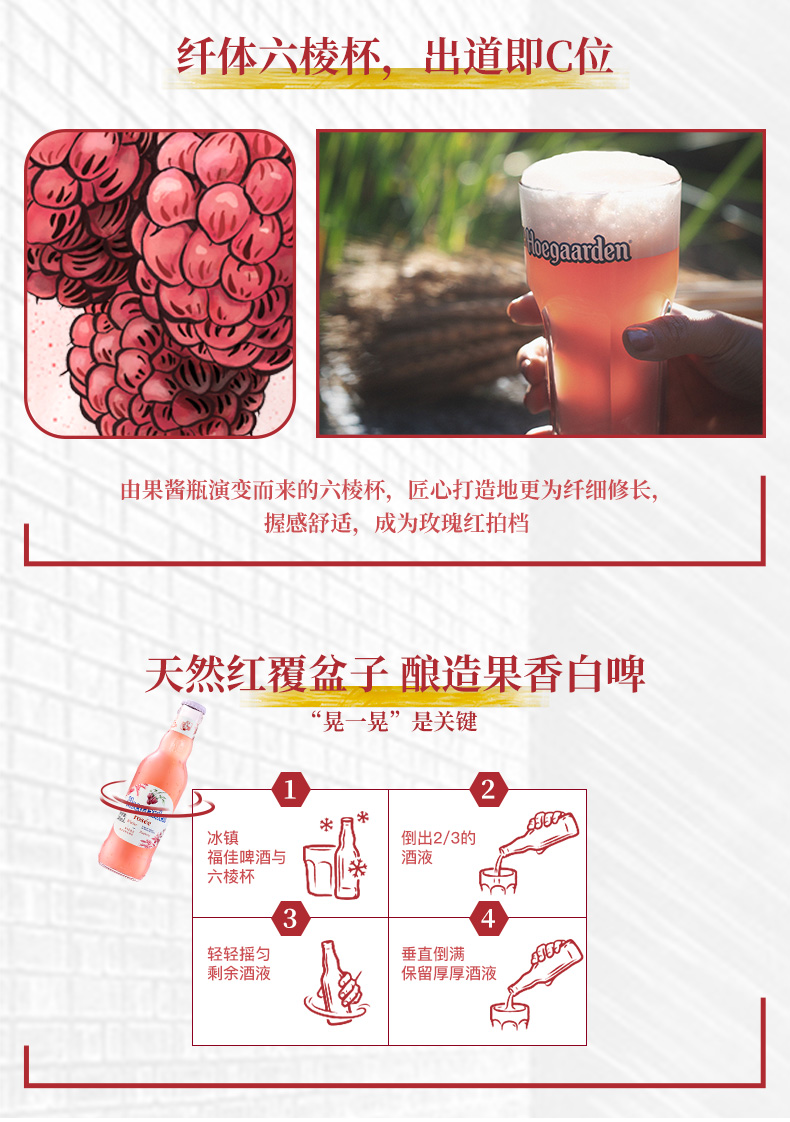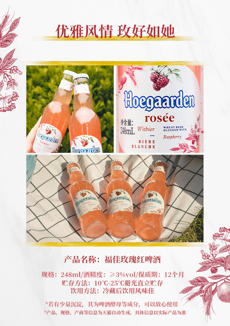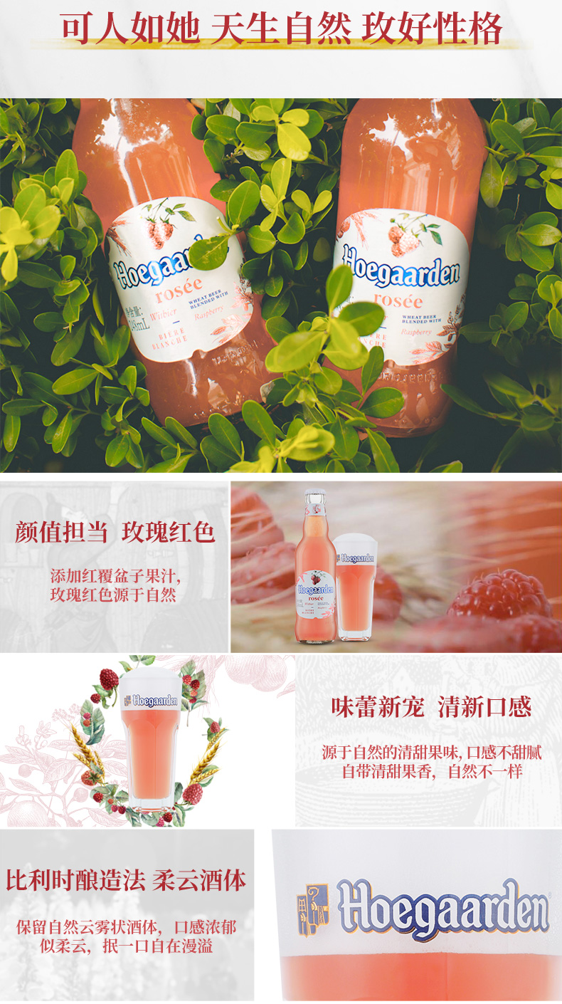 这款福佳 比利时风味 精酿玫瑰红果啤酒,酒体为淡粉色,在原有的白啤基础上融入了覆盆子,采用传统艾尔酿造法,未经过滤保留自然云雾状酒体,喝起来口感不甜腻,还有清甜果香,如春天的柔云,经过二次发酵后,口感更佳柔和、浓郁,天然玫瑰红色酒体,清新自然,萌化身心。
