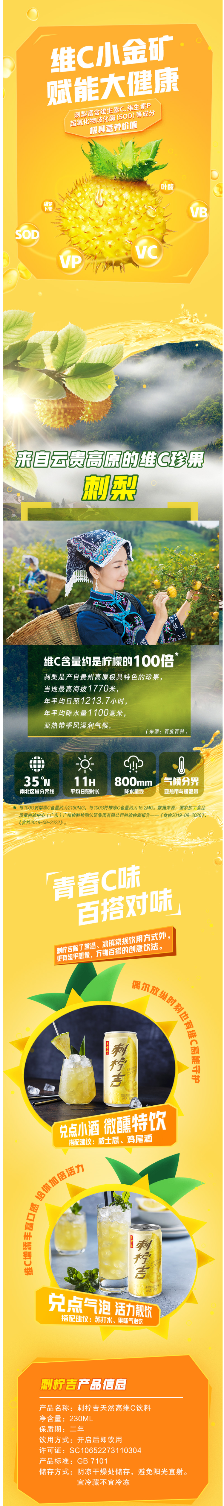 王老吉刺柠吉复合果汁将刺梨和柠檬进行结合,既使得刺梨汁的口感变得更加爽口,同时也使得维生素C含量进一步提高。一罐刺柠吉复合果汁的维生素C含量约等于9个柠檬。