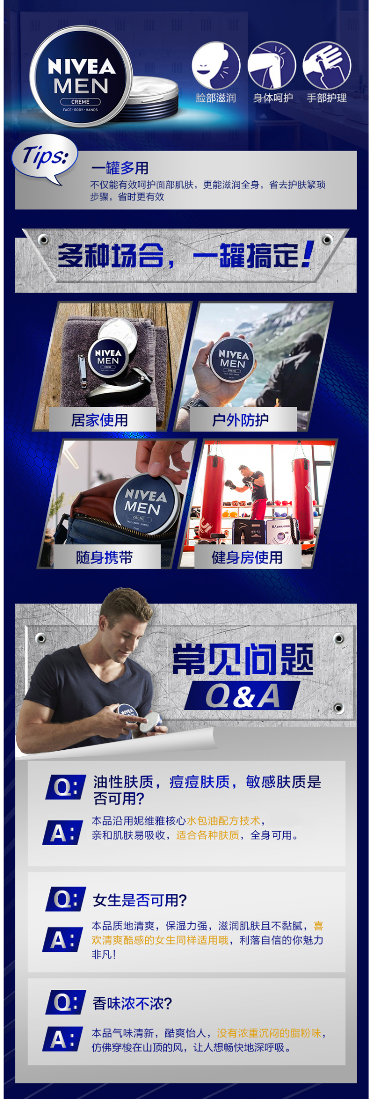 这款妮维雅 男士保湿补水面霜,俗称“男罐”,是一个比较便宜的大碗的产品,质地柔软比较容易化开,早上洁面后抹一次,能滋润一整天!