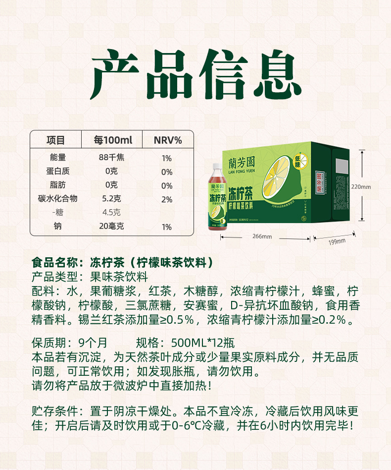 这款兰芳园 港式冻柠茶,精选锡兰红茶为原料,茶香味浓,清冽醇厚,五次过滤,去除茶涩味,再搭配美国青柠汁入口酸爽不怕腻,荆花蜂蜜,香甜温润,爽口去燥,0蔗糖成分,好喝更健康。