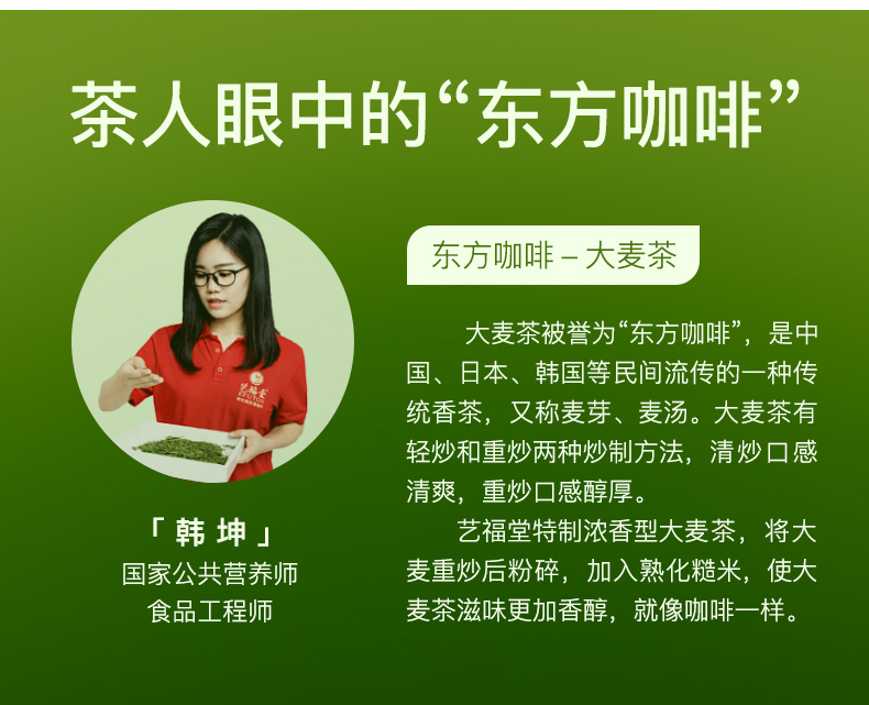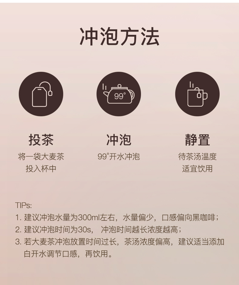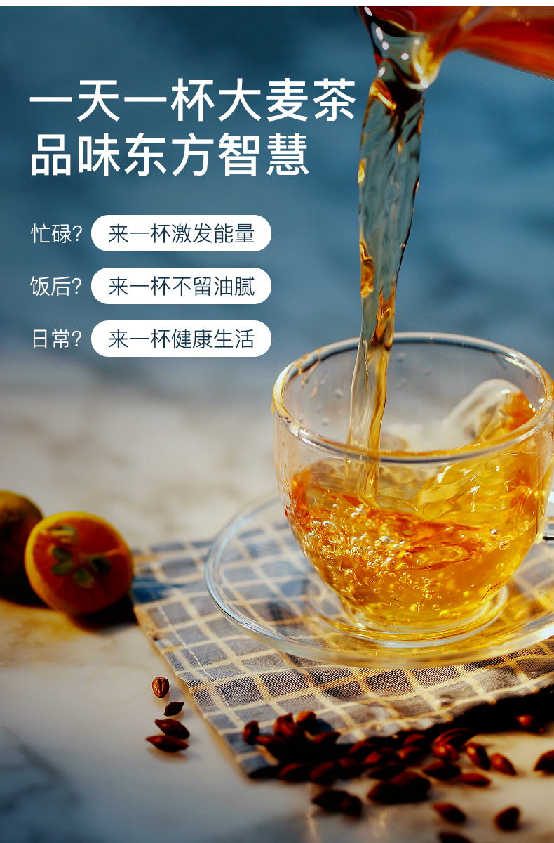 饭后一杯大麦茶,解腻助消化,麦香馥郁,微带烘焙的香气,微带茶叶的苦涩和咖啡的口感,大人小孩都喜欢,是吃火锅烤肉之类的油腻食品的最佳搭档~