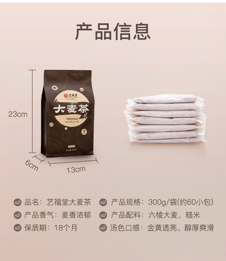 这款艺福堂 大麦茶,是20位研发人员,历经2年研制出的秘制配方,采用精品六菱大麦和熟化糙米,科学配比制成,汤色金黄透亮、醇厚爽滑,麦香浓郁。累计有5.7万4.9高评,规格:300g/袋,约60小包。