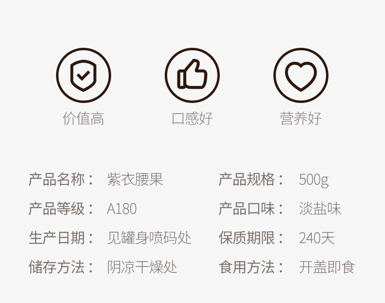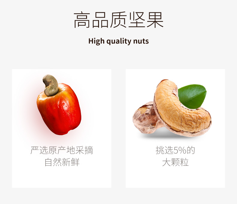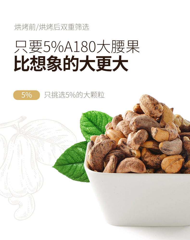 这款觅菓 A180紫衣腰果 ,只要5%A180大腰果,比想象的大更大。低温烘焙,颜色自然新鲜,呈现自然黄褐色,新鲜度很高。口感香甜回甘,低温烘焙越嚼越香,吞咽后有一股淡淡的甜味,高温或油炸吞咽后有微微反酸感。