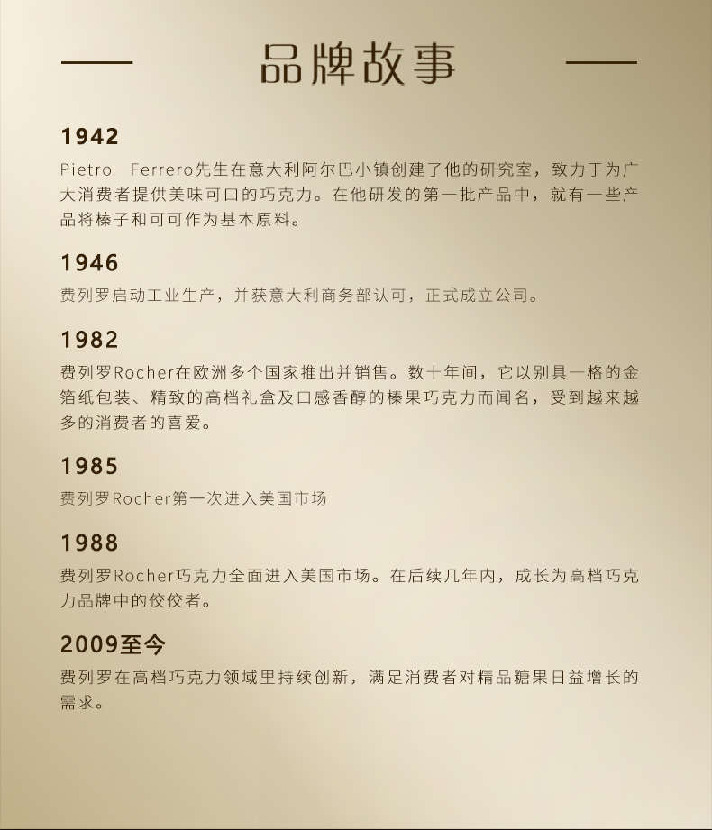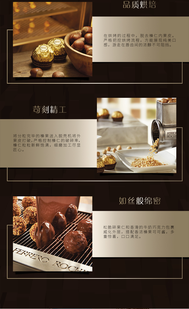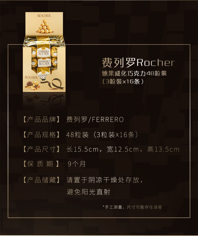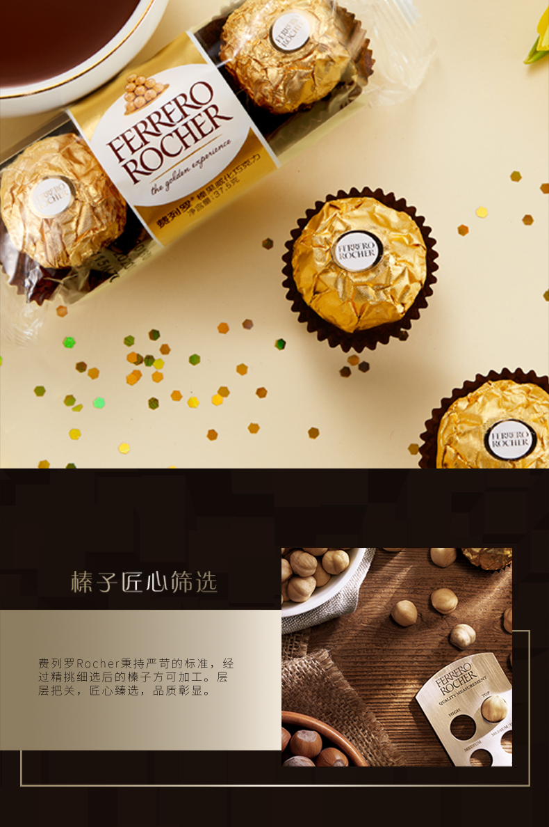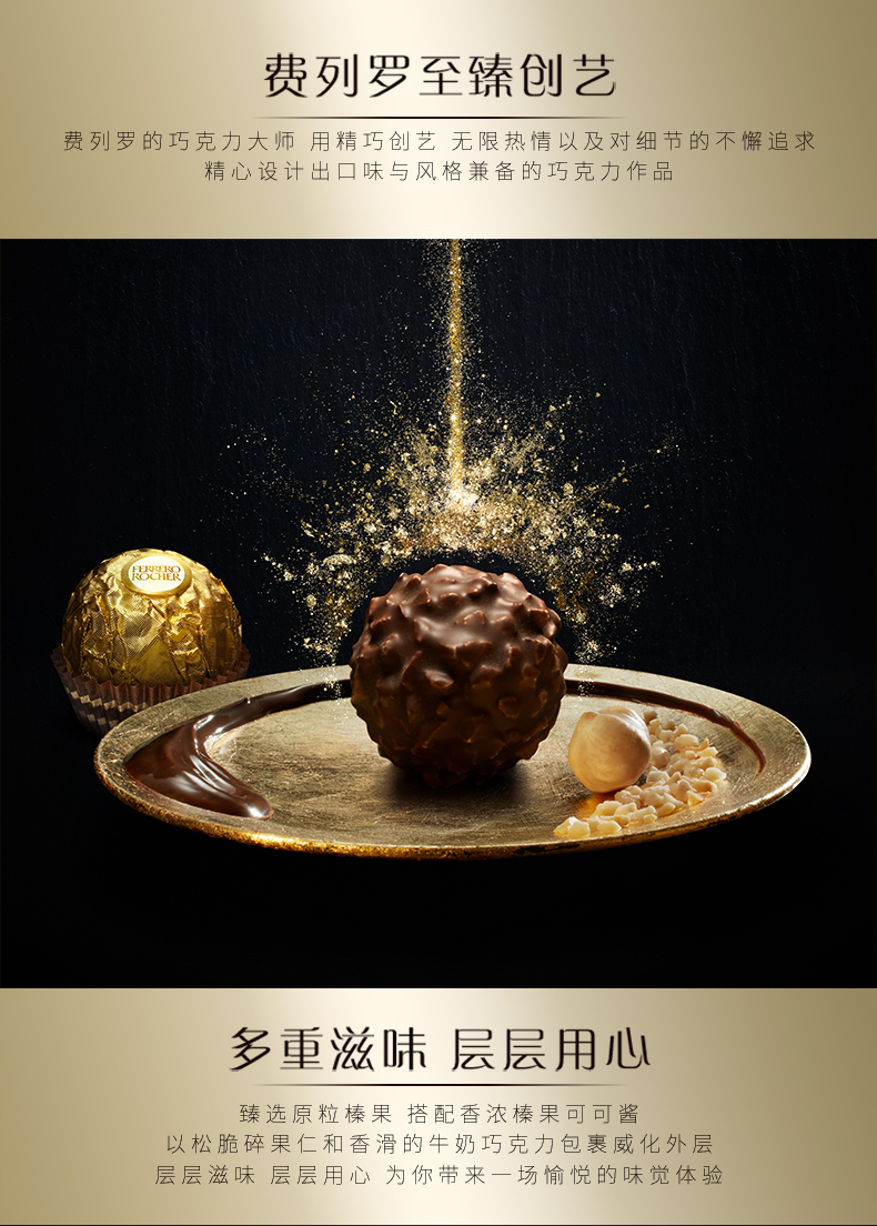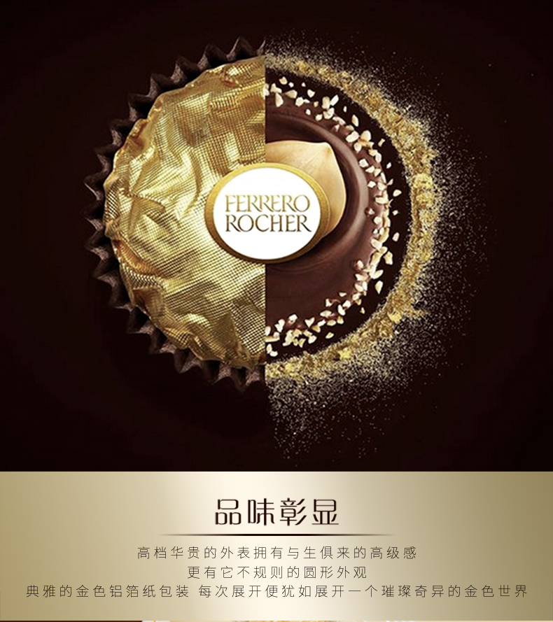 意大利费列罗Rocher是世界著名巧克力品牌,是国人比较热衷的巧克力产品。原创配方、精心制作、雅致包装和开创性的推广活动;新颖的形状 – 圆形却不规则 – 与金箔纸独立包装,让其尽显典雅华贵;独特风味呼之欲出:外层香浓巧克力,内有松脆威化及香滑榛果可可酱和原粒榛果,带来多种口感的享受。