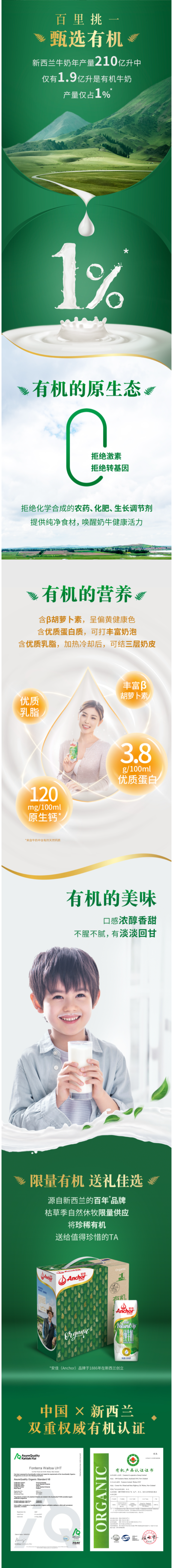 这款安佳Anchor有机纯牛奶,重视奶源,用优质有机饲料喂养奶牛,得到高质量的纯净鲜奶,还富含β-胡萝卜素,会使奶呈现偏黄健康色。