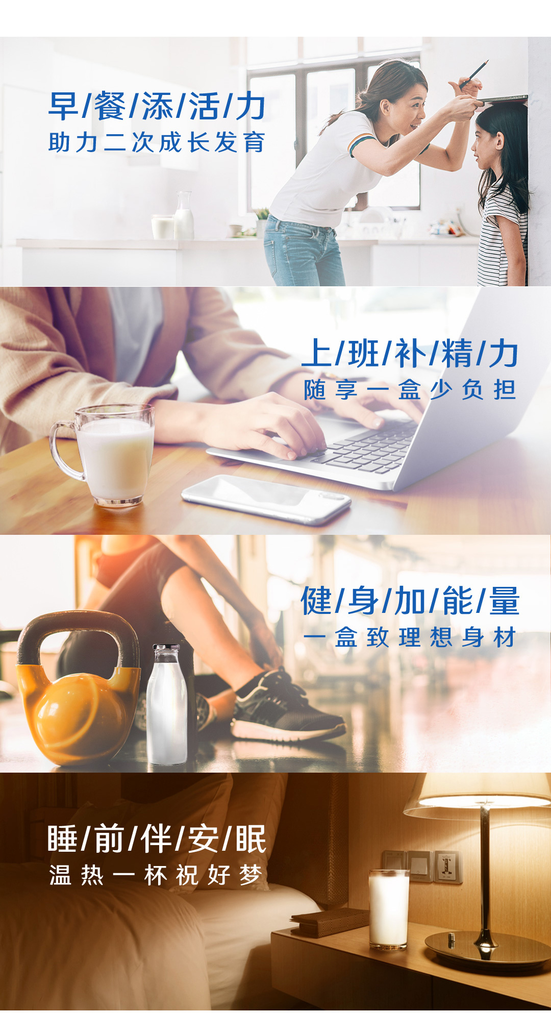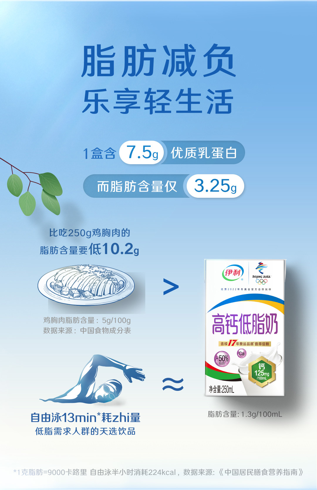 每100毫升含优质乳蛋白3.0g、原生钙125mg,补充身体所需营养,脂肪含量只有1.3g,好喝不胖。