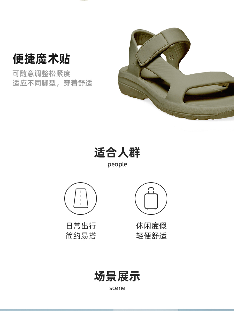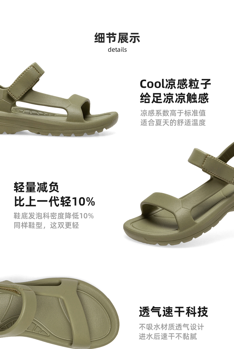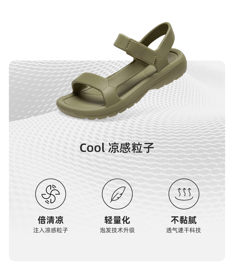 这款DUOZOULU 多走路 男女款凉感轻便凉鞋,Cool凉感粒子,凉感系数高于标准值,给足凉凉触感,适合夏天的舒适温度。轻量减负,鞋底发泡科密度降低10%,同样鞋型,这双更轻。透气速干科技,不吸水材质透气设计,进水后速干不黏腻。便捷魔术贴,可随意调整松紧度,适应不同脚型,穿着舒适。