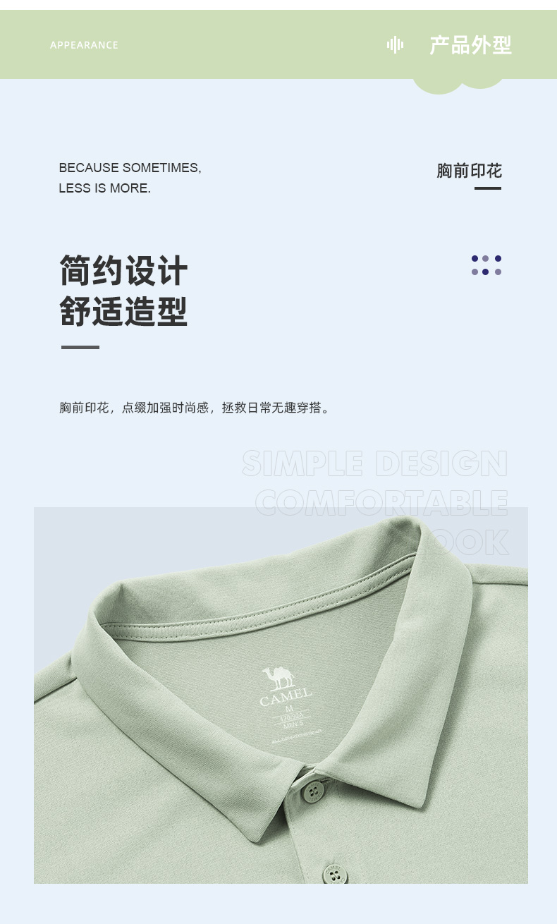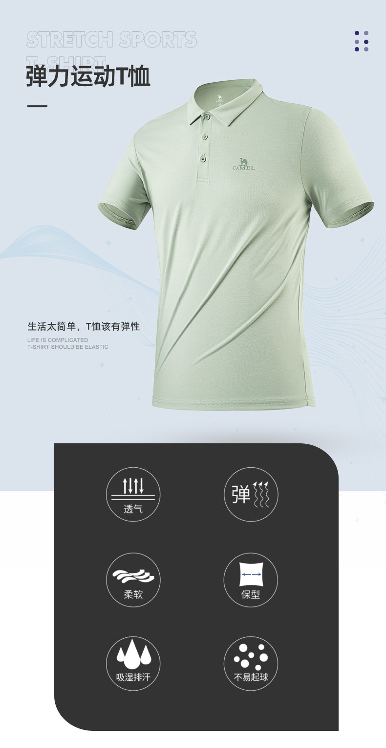 这款骆驼的Polo衫,采用聚酯纤维面料,使用速干工艺处理,面料呈网状组织生成细密小孔,具有非常好的速干、透气性,带来穿着凉爽、舒适的穿着体验,能更好地适应夏天天气热、容易出汗的环境。款式方面,经典翻领设计,立体剪裁、能很好的修饰身材,适合各个年龄段!