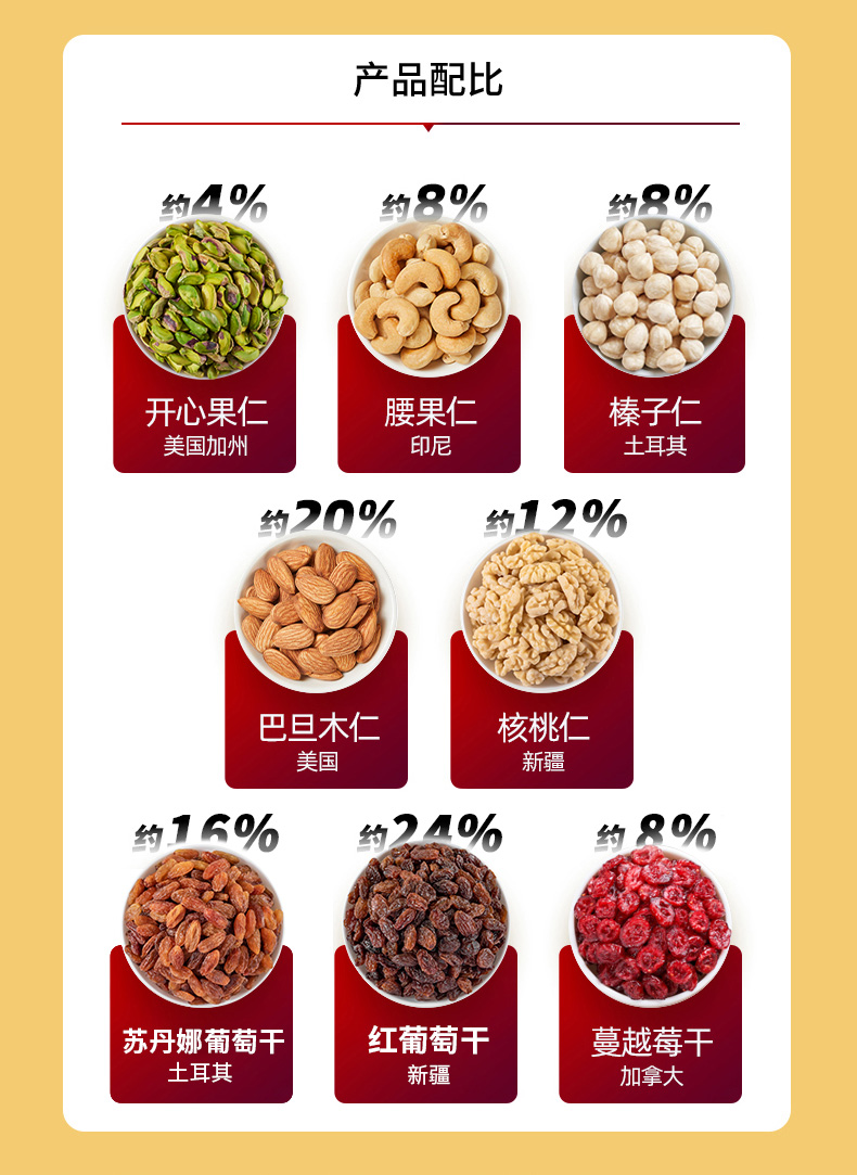 这款天虹牌 每日坚果大礼包30袋750g,内含:核桃仁、开心果仁、巴旦木仁、腰果仁、榛子、曼越莓、黑加仑,5+2均衡科学配比,独特的低温烘焙工艺,轻加工,健康更美味。独立锁鲜,干湿分离,营养不串味。
