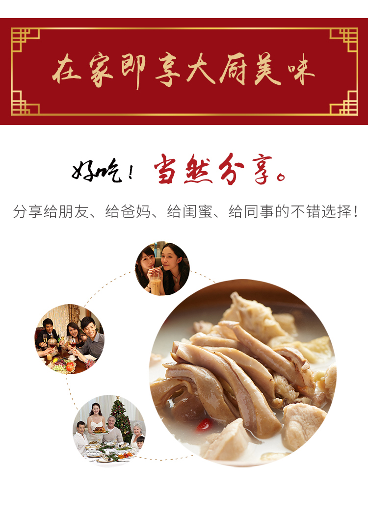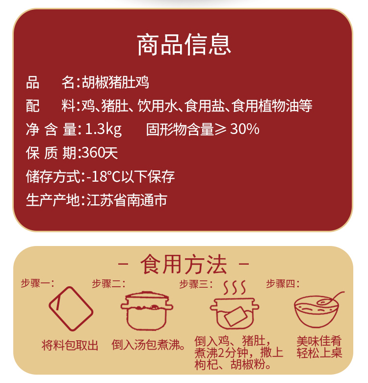 这款王府邦瑞胡椒猪肚鸡优选鲜嫩鸡腿肉和弹牙猪肚,融入慢熬浓汤,由五星级酒店厨师监制,鸡肉鲜香爽滑,猪肚爽脆弹牙,配上辛香胡椒和枸杞,别有一番风味,可直接当作一款汤品,也可添水当作一顿滋补的涮锅,食用非常方便。