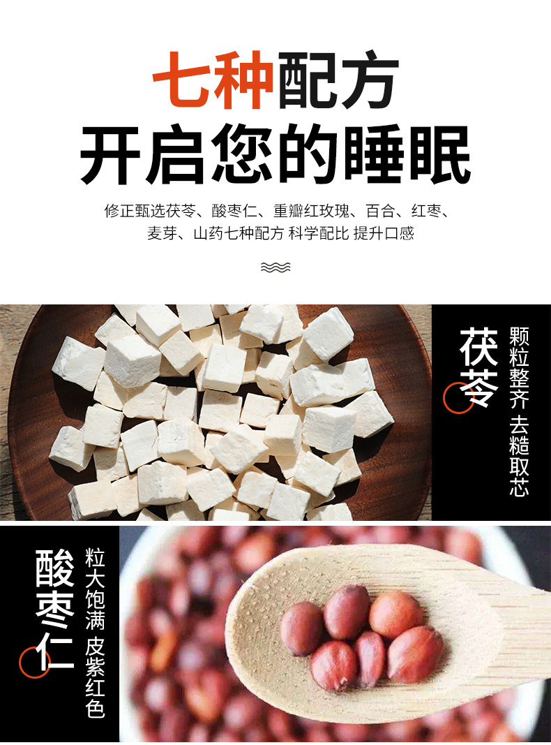 这款修正茯苓酸枣仁茶采用百合、茯苓、莲子、淮小麦、酸枣仁、山药等药食同源成分,通过临界萃取技术,精制而成,适合失眠人群、需要提高睡眠质量的人群饮用,规格为3g*40袋,于睡前半小时-1小时当做茶饮冲泡饮用即可。