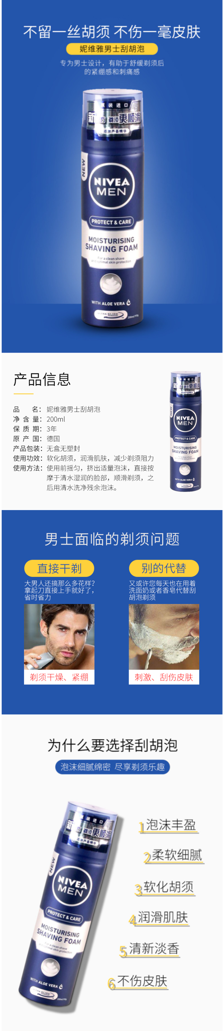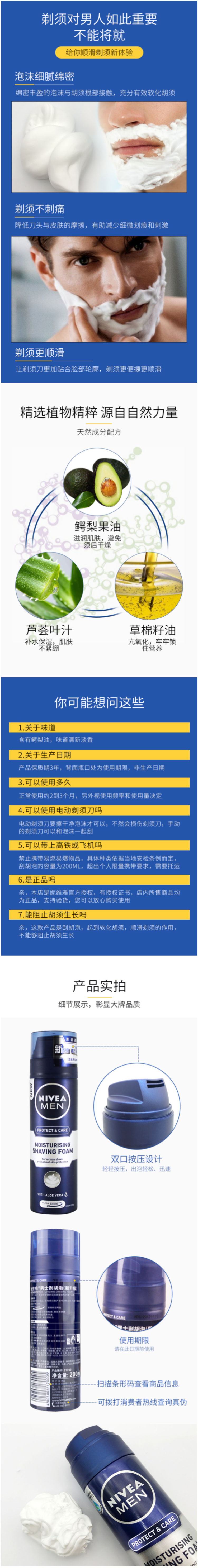 天猫官方店出品,质量没问题,价格上也更划算。剃须前用剃须泡沫软化胡须,并提供保护膜,让剃须更顺滑净爽。