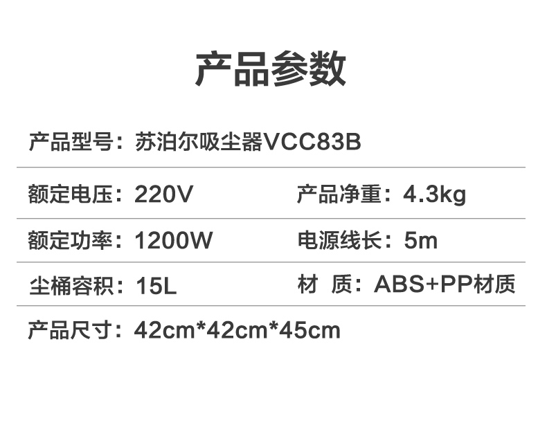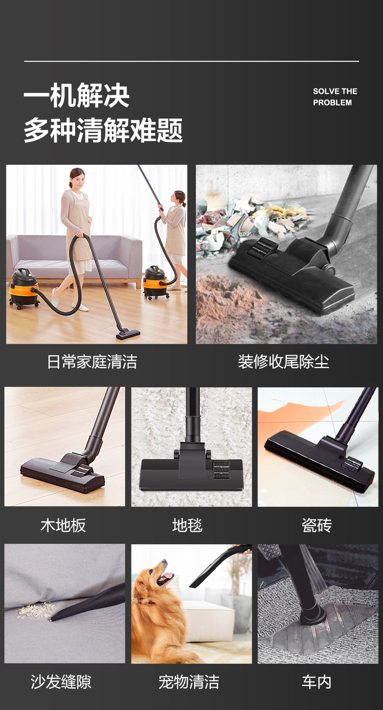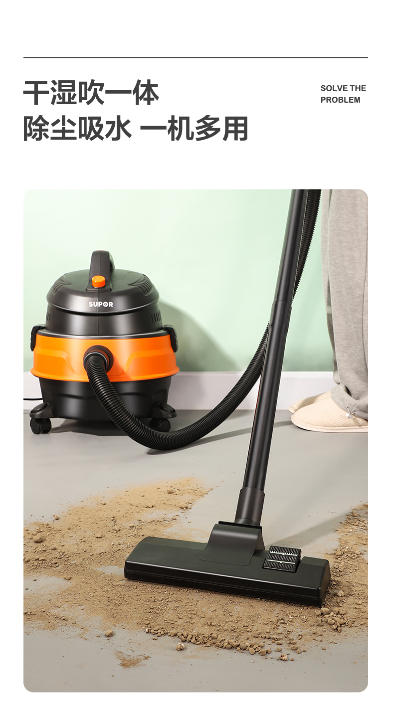 苏泊尔出品大吸力吸尘器,干湿吹三用,配备4种原装吸口,1200w大吸力,可以轻松吸扁水桶,实测噪音值75分贝,和正常说话时分贝差不多,一机搞定装地毯、沙发、浴室积水、厨房垃圾、装修垃圾等等。