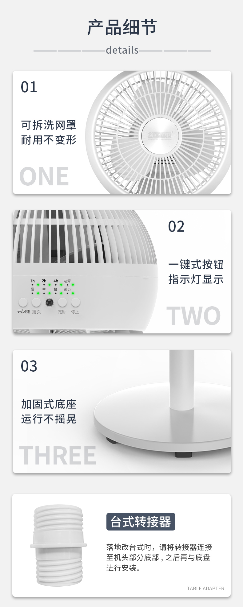 作用原理:普通风扇是单纯的利用叶片快速转动,使风扇面前的空气快速流动,使人体表面水分蒸发,吸收热量,从而让人体感到凉爽;空气循环扇主要作用是将室内空气形成对流循环,以合理的空气流向达到平衡温度的效果。