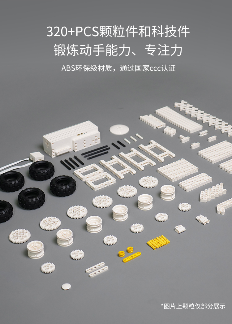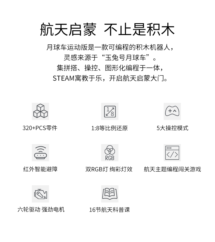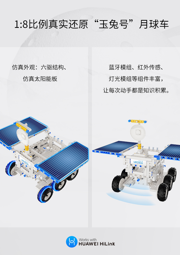 这款UBTECH 优必选 华为Hilink控制 1:8仿真月球车 运动版,共有320+颗粒,是一款可编程的积木机器人,灵感来源于“玉兔号月球车”。集拼搭、操控、图形化编程于一体,STEAM寓教于乐,开启航天启蒙大门。1:8等比例还原,仿真外观:六驱结构,仿真太阳能板、蓝牙模组、红外传感、灯光模组等组件丰富,ABS环保及材质,通过国家CCC认证,五种操控模式,红外智能避障,双RGB七色炫彩灯效,APP内置编程闯关游戏,使用Scratch图形化编程,指挥游戏中的机器人去探索太空,克服各种障碍到达目的地,同时收集能量宝石。