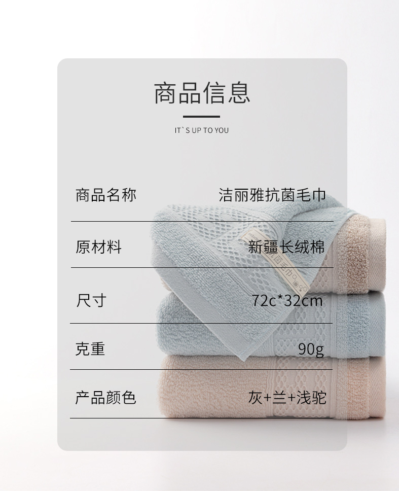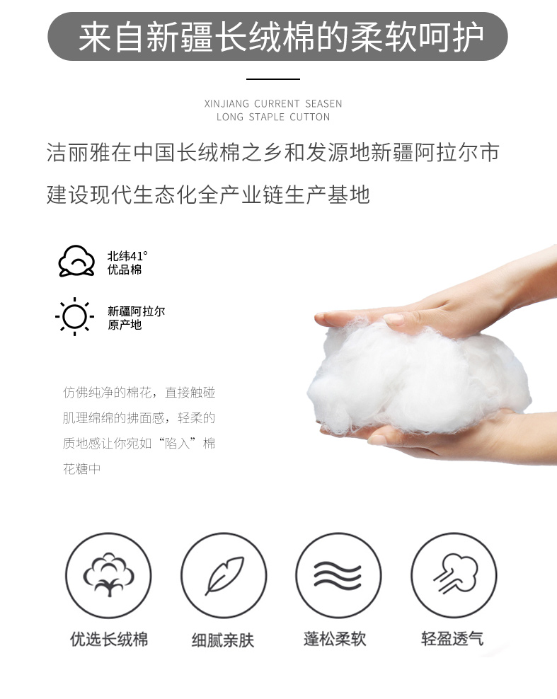 洁丽雅在中国长绒棉之乡和发源地新疆阿拉尔市建设现代生态化全产业链生产基地,品质好毛巾,采用原生好棉,100%新疆长绒棉材质,毛巾柔软蓬松,细腻亲肤,轻盈透气吸水性好,德国司马抑菌技术,减少细菌繁殖同时对人体皮肤自然菌群不产生影响,A类标准,无荧光剂,无甲醛、无芳香胺、无致敏源等,轻柔呵护,舒适安全。