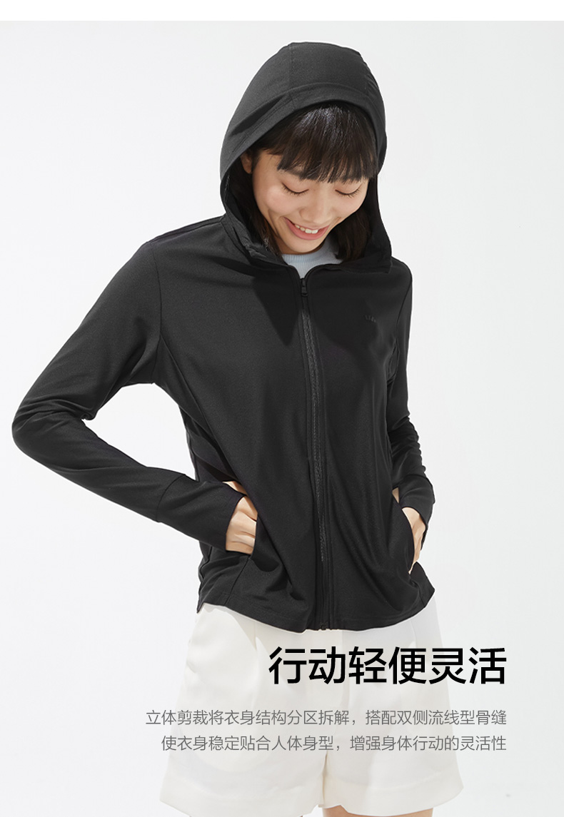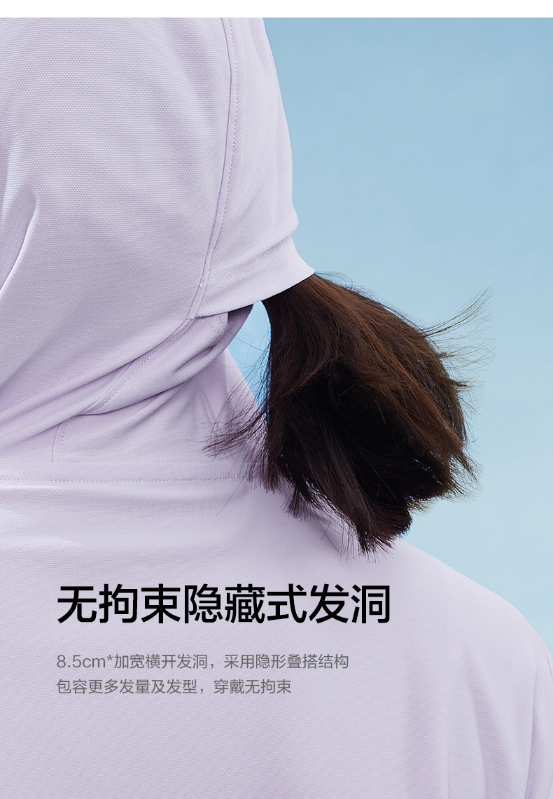 加宽深帽型,贴合包裹头部,8.5cm加长领口,颈面一体防晒,袖口拇指扣设计,有效防止手背晒伤,穿着更灵活。
