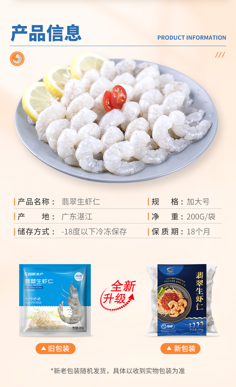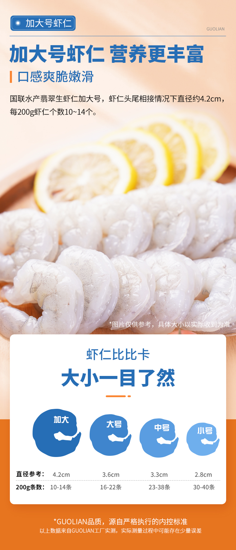 国联水产翡翠生虾仁加大号,虾仁头尾相接情况下直径约4.2cm,每200g虾仁个数10~14个。优选鲜虾活虾,去壳去虾线,口感弹嫩鲜滑爽口,营养丰富。