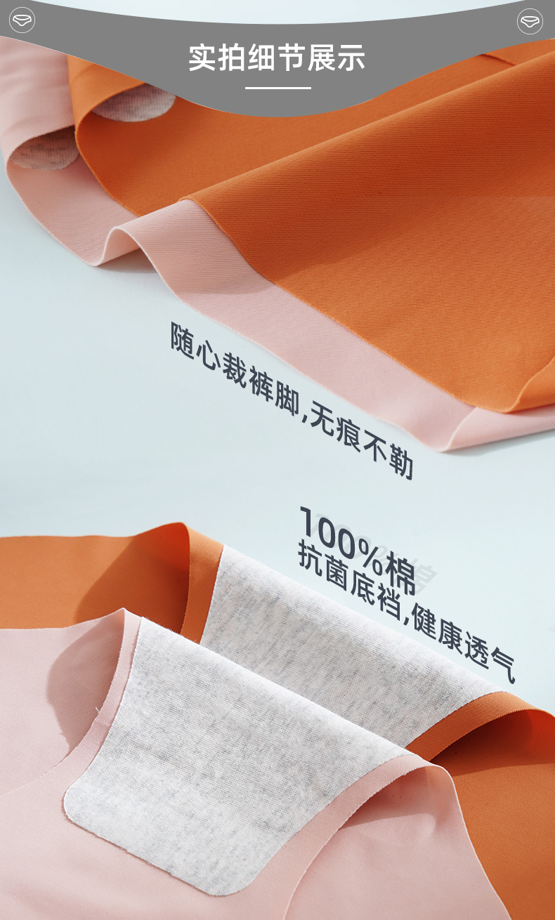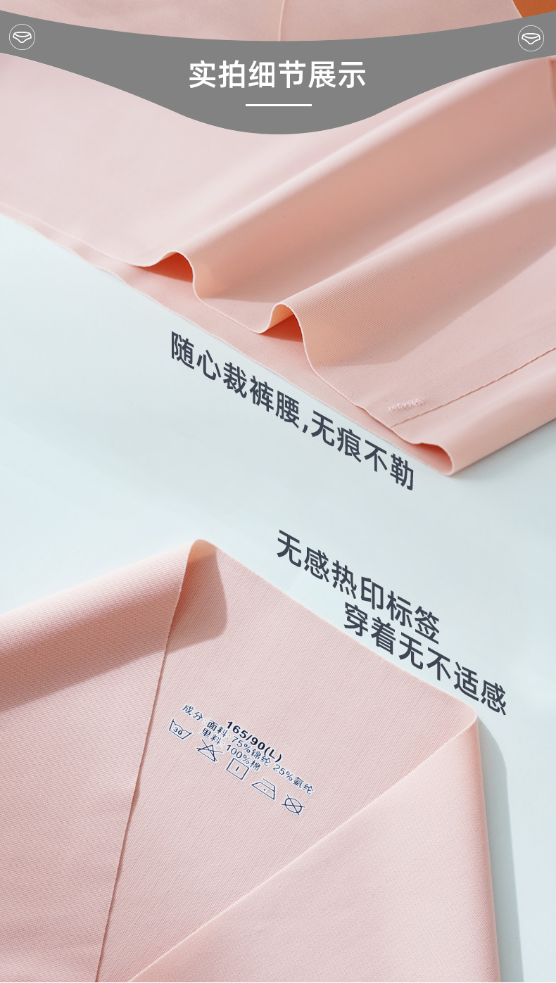 细节上:整体中腰设计,腰部压胶式缝合锁线,无痕不卷边,烫印无感标签,舒适不磨皮肤,过水不脱胶,加宽裆部,贴合舒适不夹臀。莫兰迪色系,天然植物印染,健康不掉色。