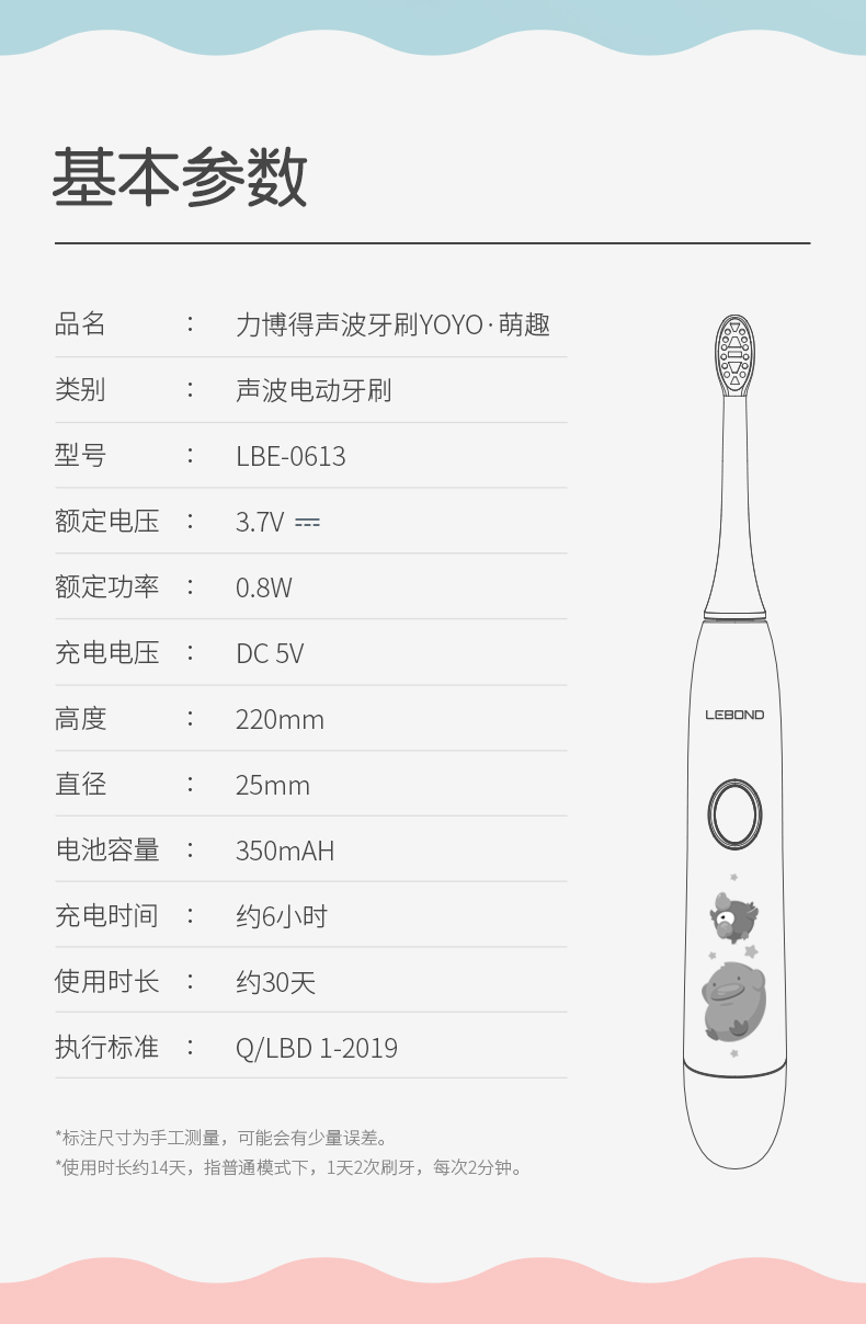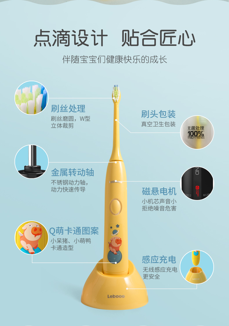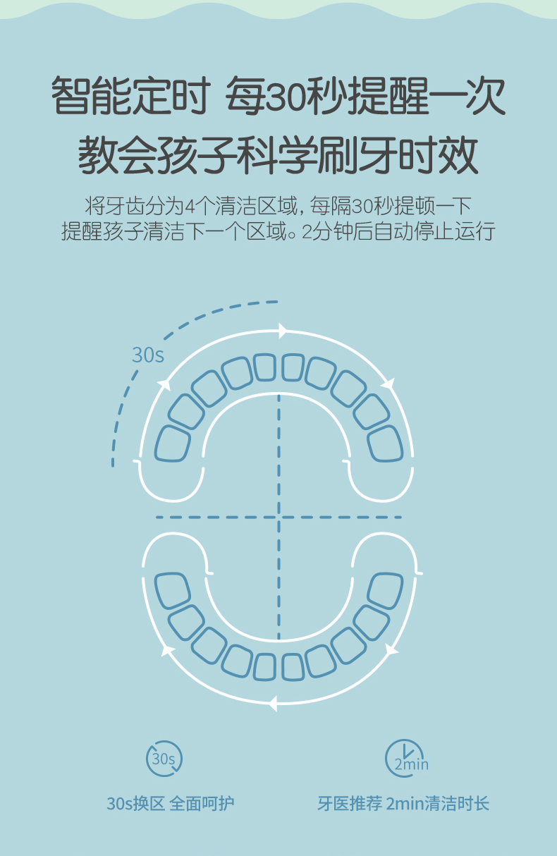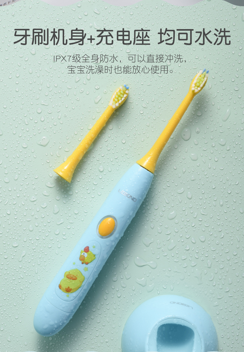 这款儿童电动牙刷,采用国家专利磁悬浮小机芯,机身纤细更适合宝宝掌握,有清洁模式32000次/分、轻柔模式26000次/分 2种模式,2分钟智能定时每30秒提示,5mm振幅温和舒适更适合宝宝幼嫩口腔,USB无线感应充电,轻轻-放即可充电,宝宝自己也可安心充电,电池容量350mAh, 5小时左右充满,续航约30天左右,机身IPX7级防水,可直接冲洗。