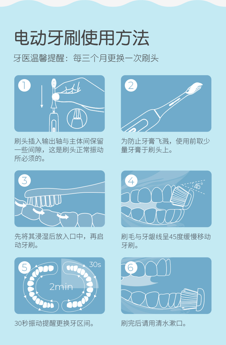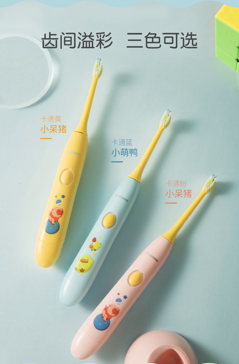 刷头采用0.12mm美国杜邦细软刷毛,柔软抑菌,顶部磨圆设计,柔软不刺激,避免伤害宝宝娇嫩牙龈,深入牙齿缝隙,温柔清洁牙垢;刷毛褪色提示,月3个月出现褪色,提醒更换,保持卫生使用更安心。