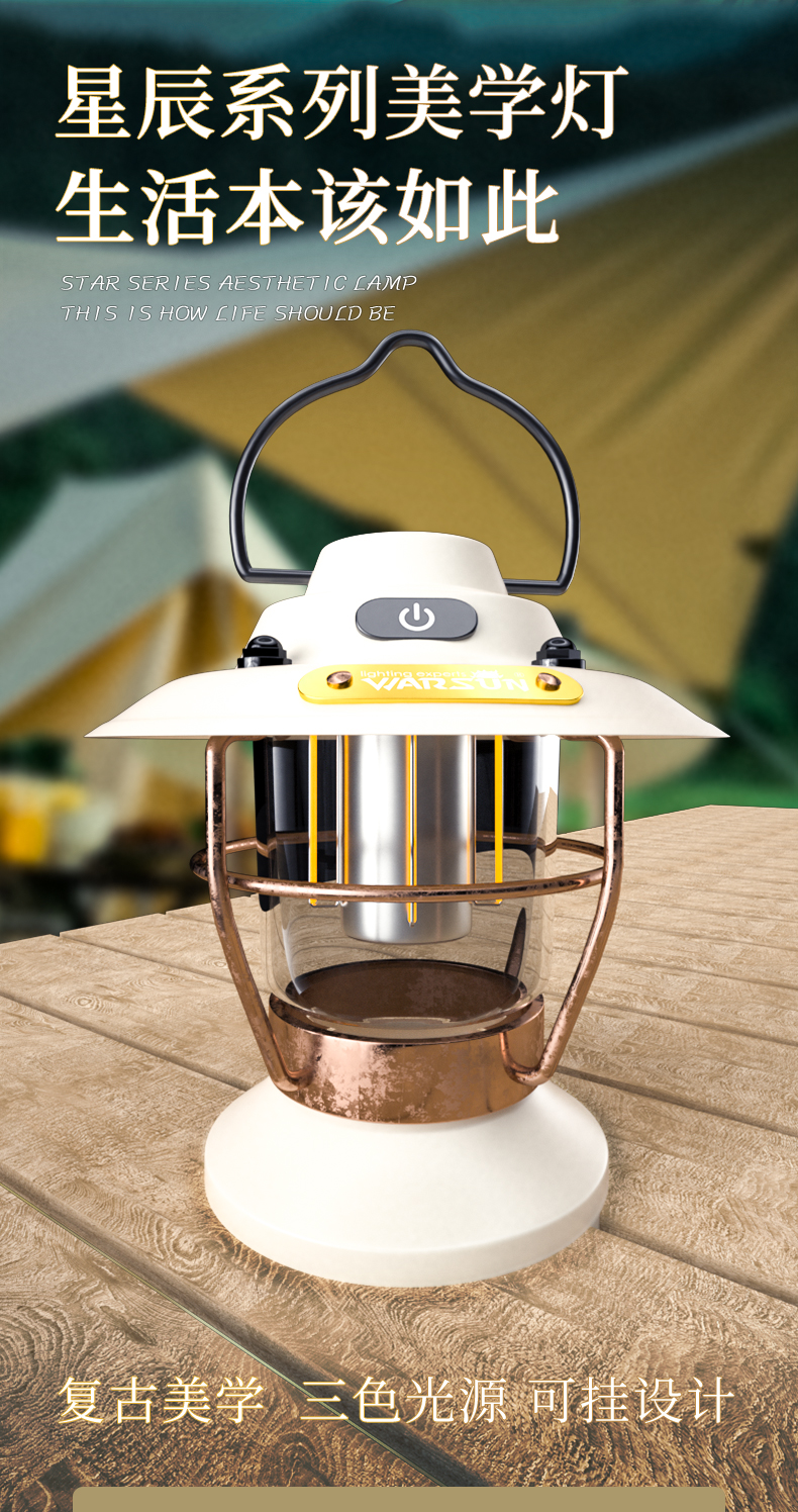 天猫warsun旗舰店89.8元,可领20元优惠券,实付69.8元到手,前2款此价。这款沃尔森 户外复古照明露营灯,星辰系列复古造型,三色光源,多种模式,可快充,手提悬挂,生活防水,锂电池长续航。