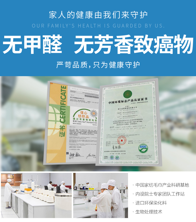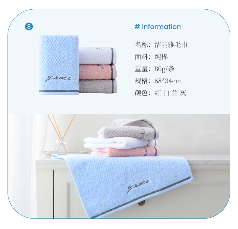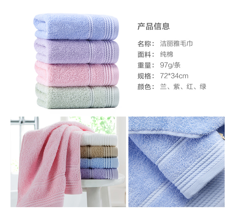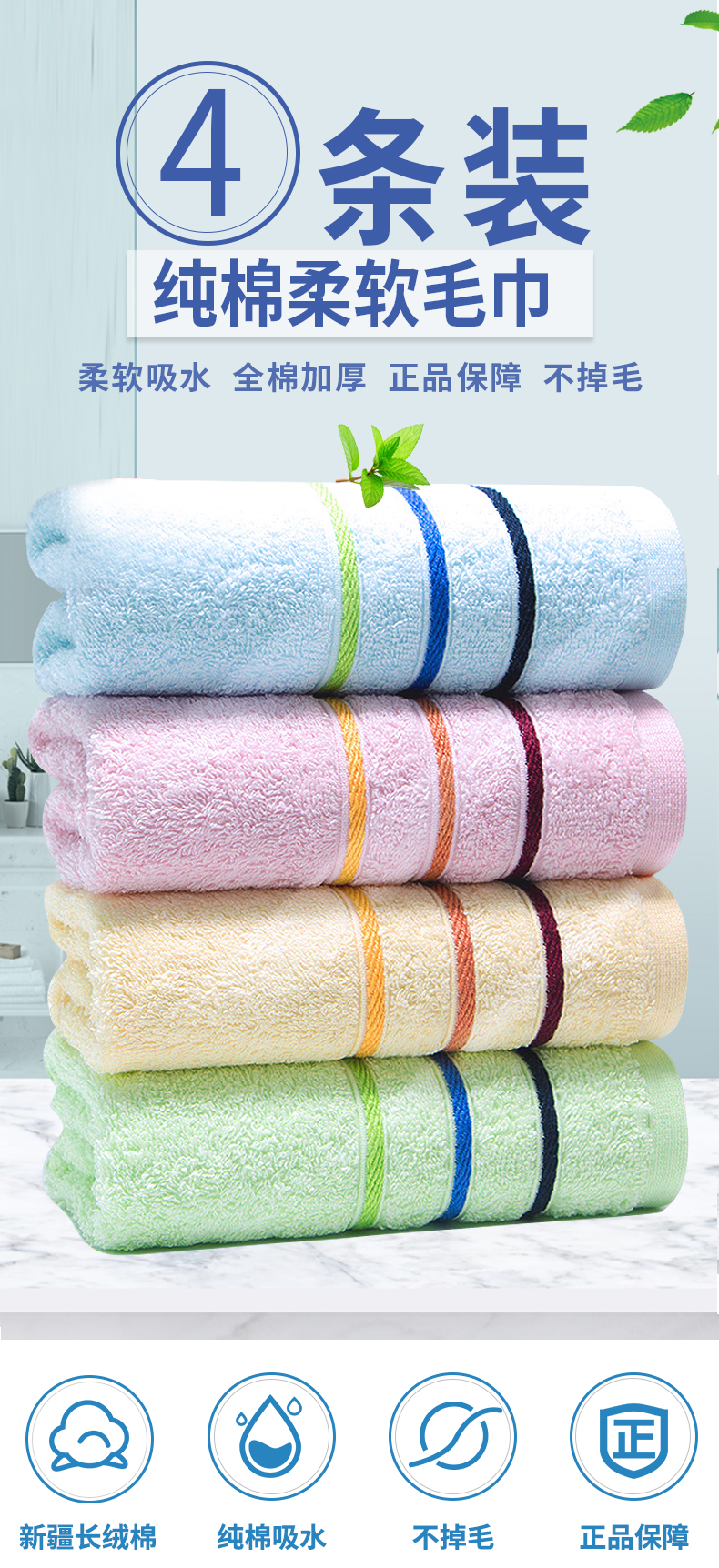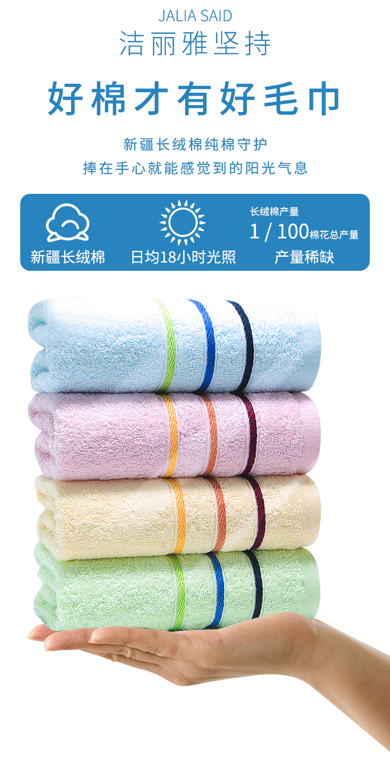 采用新疆原产地长绒棉为原料,精梳工艺,剔除短纤维和杂质、纤维更有韧性、不易掉毛;双面蓬松饱满、柔软细腻,吸水透气性好,锁边精致,结实耐用。