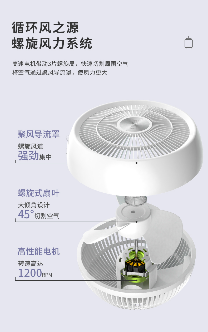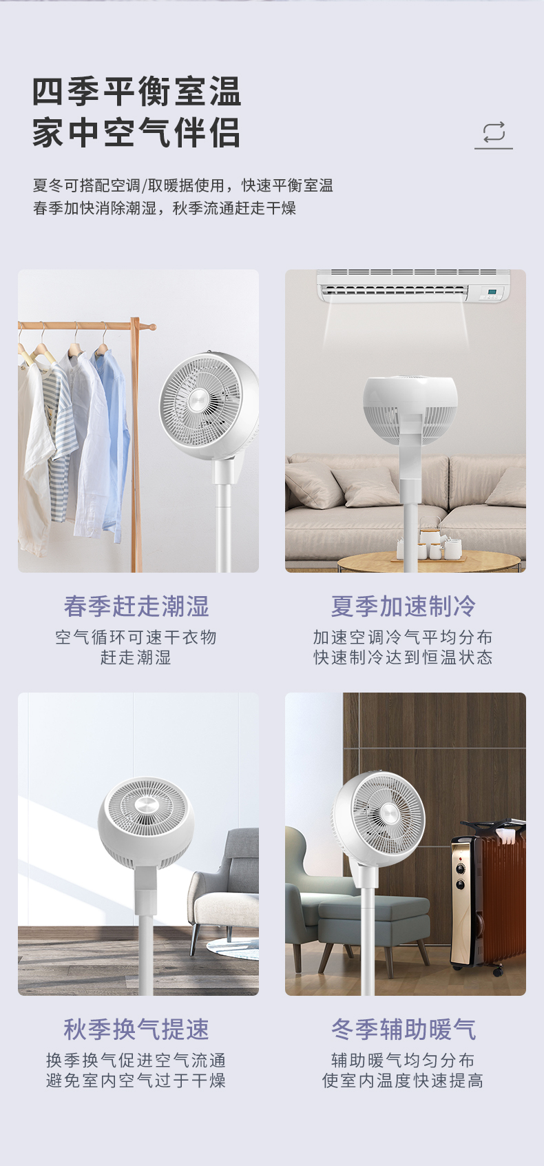 作用原理:普通风扇是单纯的利用叶片快速转动,使风扇面前的空气快速流动,使人体表面水分蒸发,吸收热量,从而让人体感到凉爽;空气循环扇主要作用是将室内空气形成对流循环,以合理的空气流向达到平衡温度的效果。