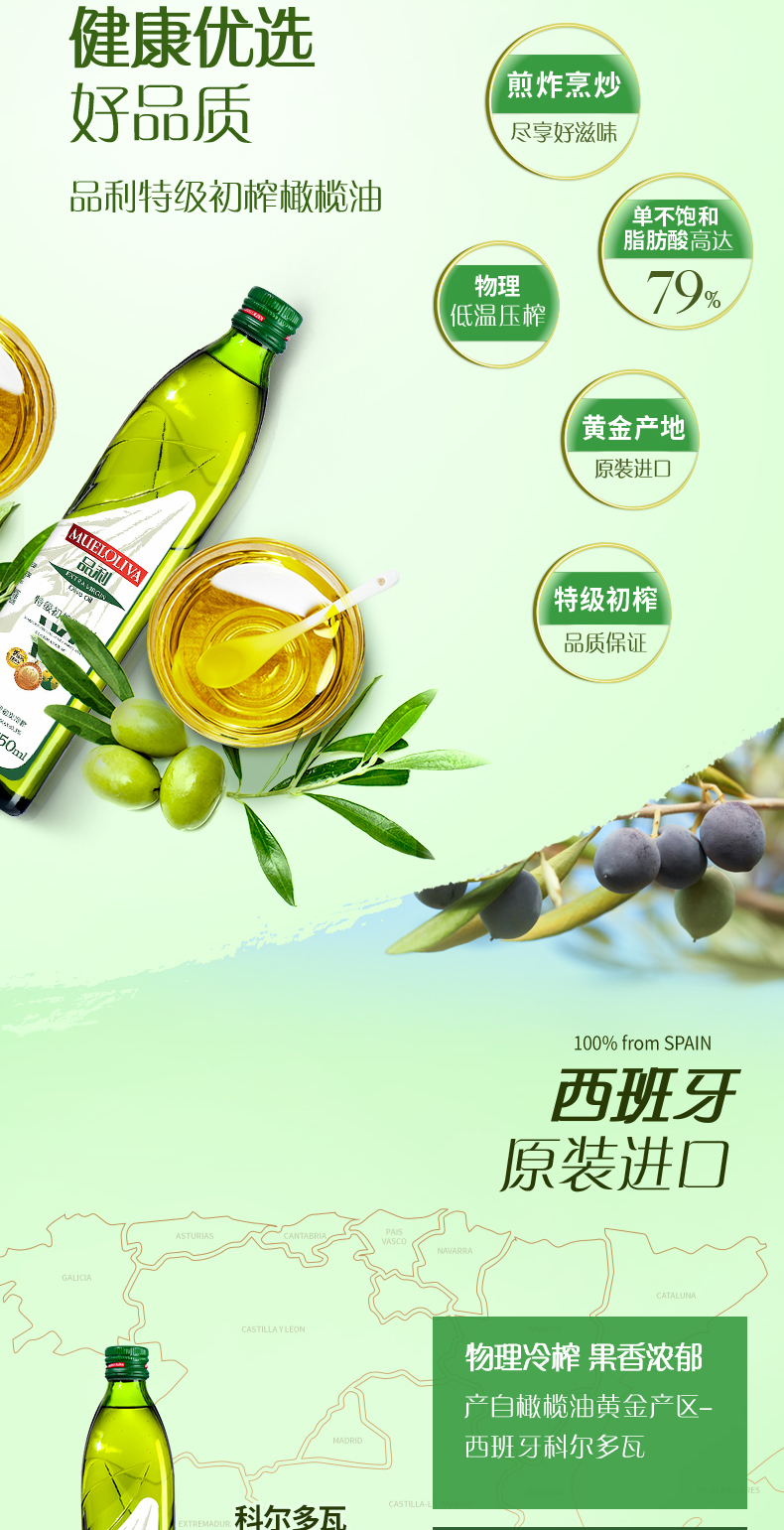 品利橄榄油采用地中海产区橄榄果为原料,采摘后24小时内冷榨而成,单不饱和脂肪酸含量79%。天然橄榄中的多配含量高达400ppm(毫克/千克),长期食用有利于人体健康。