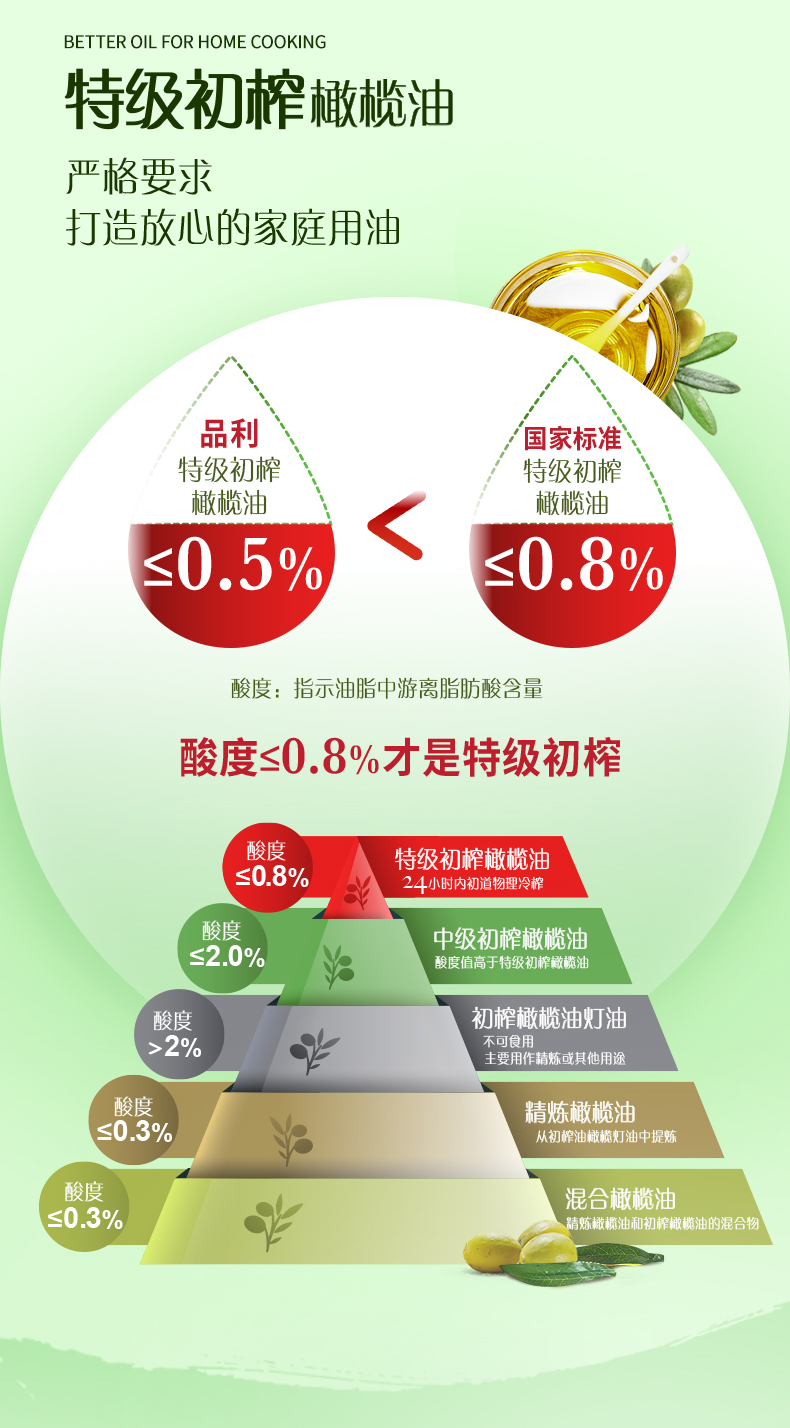 这款品利特级初榨橄榄油,西班牙原装进口,酸度≤0.5%。从酸度上来说,国际上普遍将最高等级的橄榄油(西班牙特级初榨橄榄油)的酸度定位在0.3%—0.8%之间,这个范围的橄榄油也被称作特级初榨橄榄油,酸度越低,品质越好。